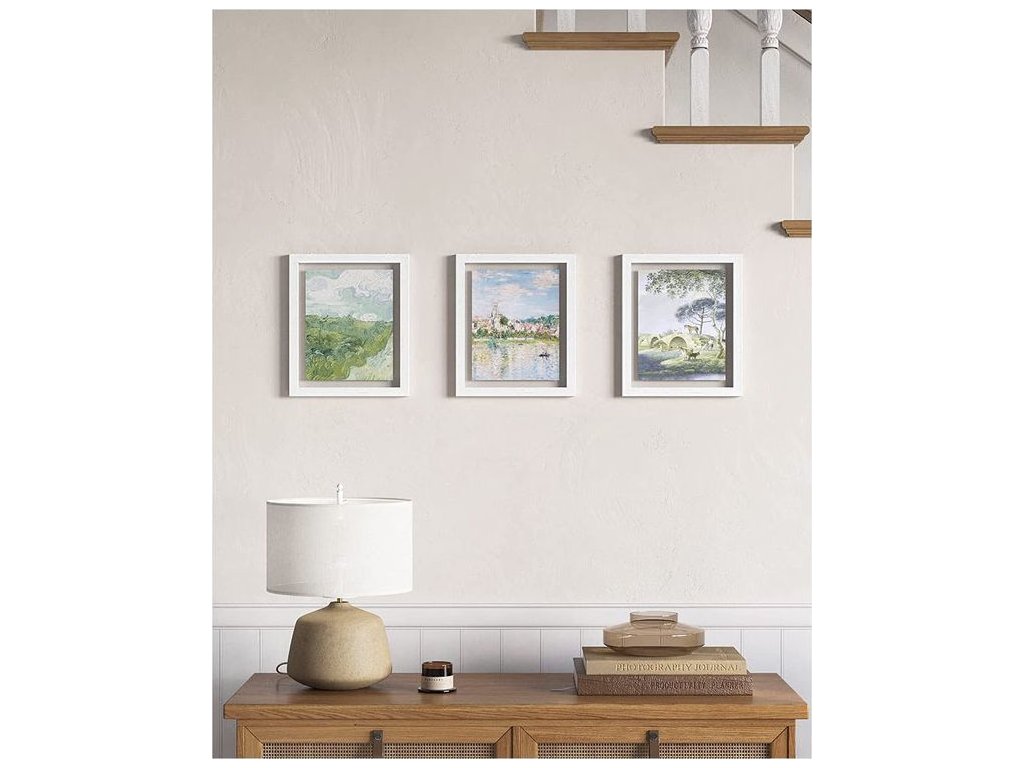 3 fotorámečky, které lze snadno připevnit na zeď pomocí skrytých otvorů na zadní straně nebo umístit na stůl pomocí přiložených kovových stojánků - horizontálně i vertikálně.