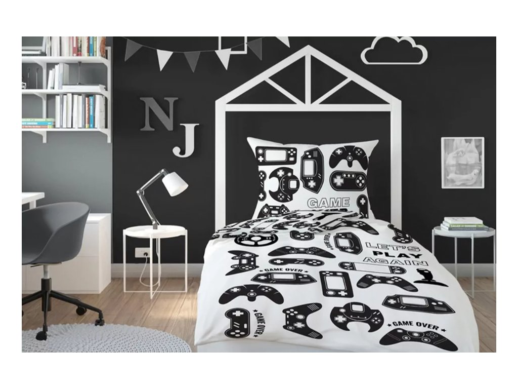 Moderní ložní povlečení v černo-bílé barvě s motivem herní konzole. Zaručeně potěší každého herního milovníka. Povlečení má oboustranné provedení. Produkt je vyroben z příjemného materiálu - bavlna. Velikost produktu 140 x 200 cm. Sada obsahuje jeden polštář a přikrývku.