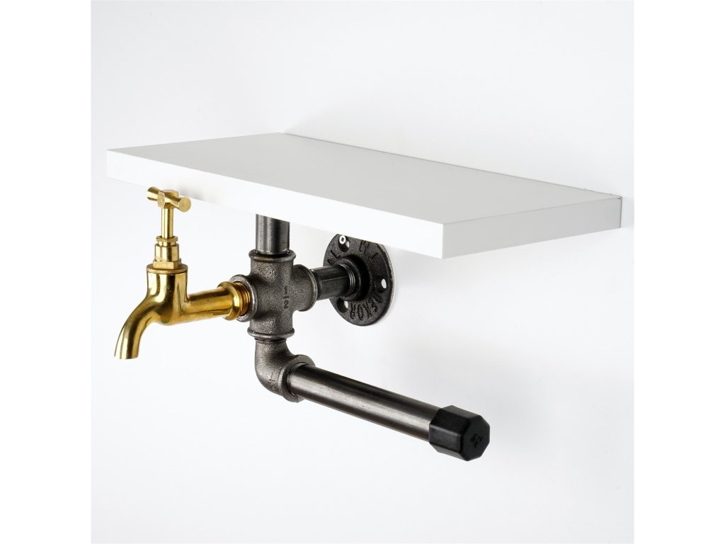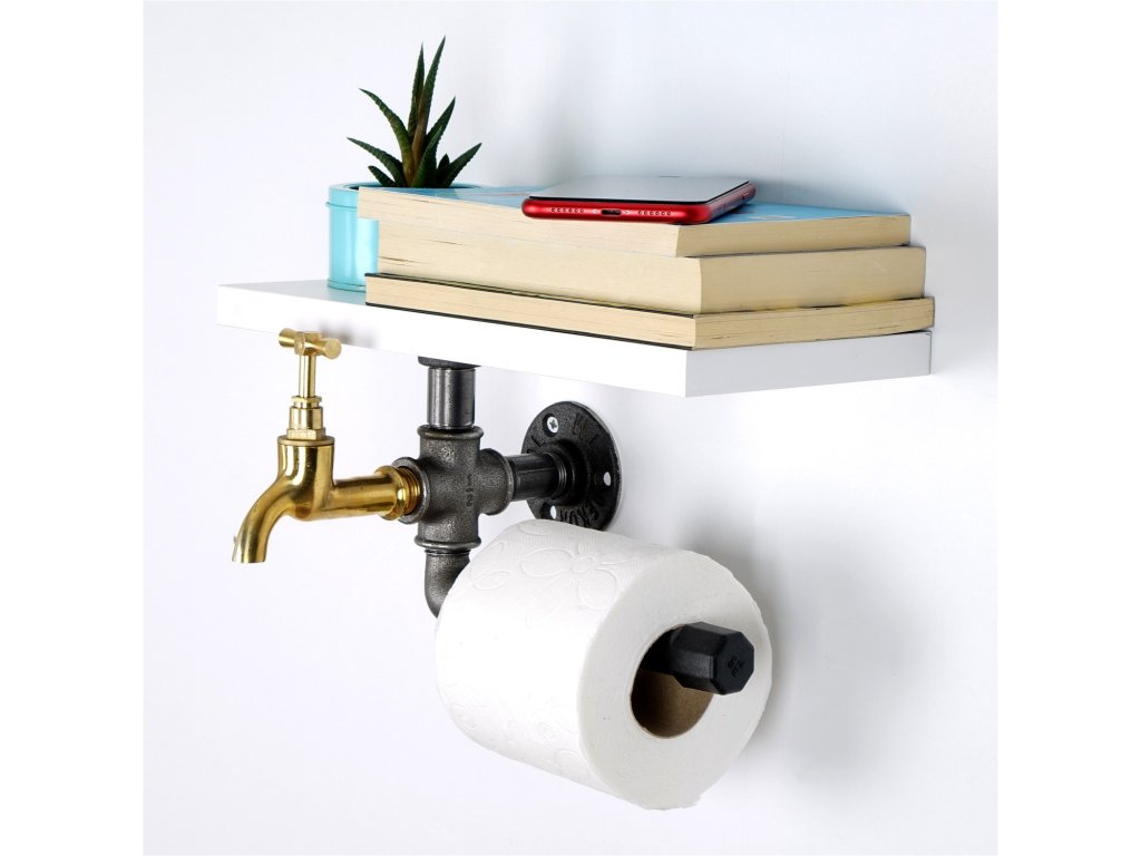 Bílý držák toaletního papíru BORURAF236 je vyrobený v industriálním stylu a má i poličku pro odložení různých maličkostí.