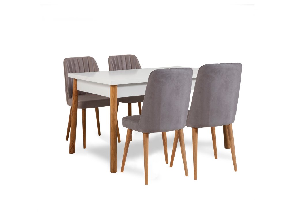 Prostorná jídelní sestava SANTIAGO s rozkládacím stolem a čtyřmi židlemi s kvalitním polstrováním.
