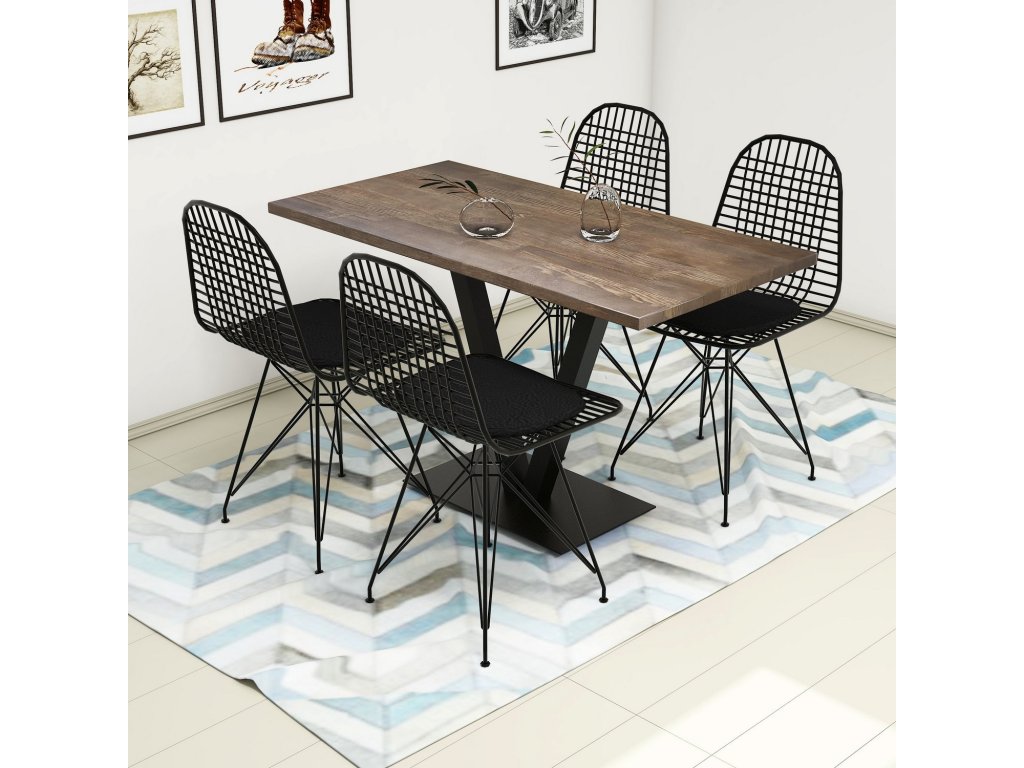 Moderní set jídelního stolu s masivní deskou a čtyř kovových židlí