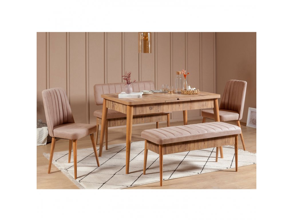 Praktický elegantní jídelní set s lavicí a lavicí s opěrkou, dvěmi židlemi a stolem z kolekce VINA v barvě borovice atlantic a béžová