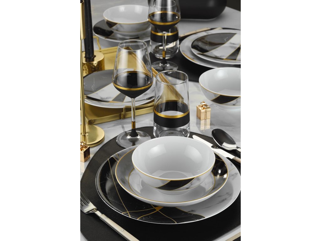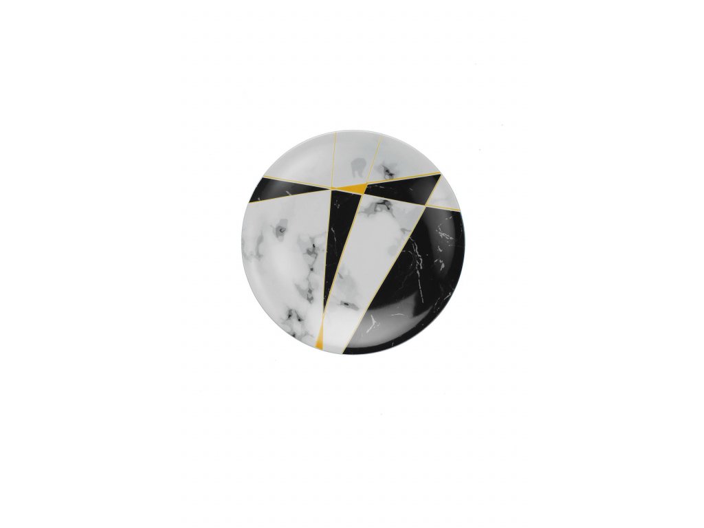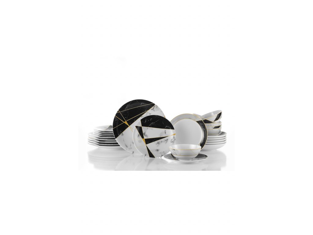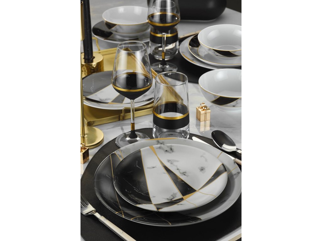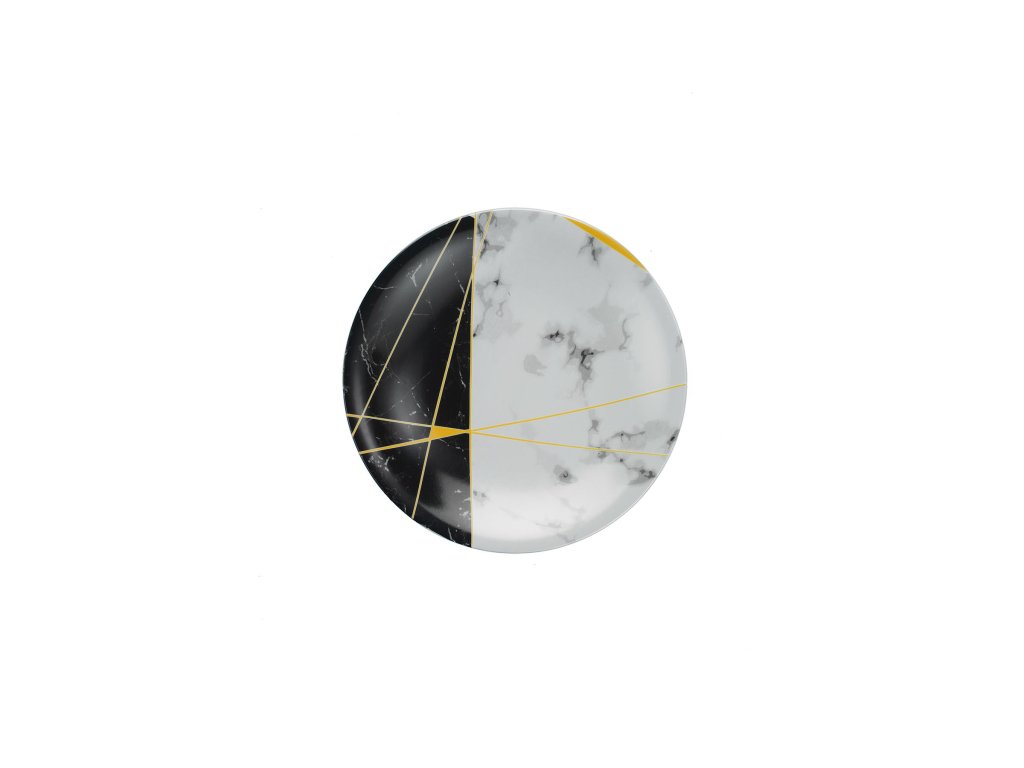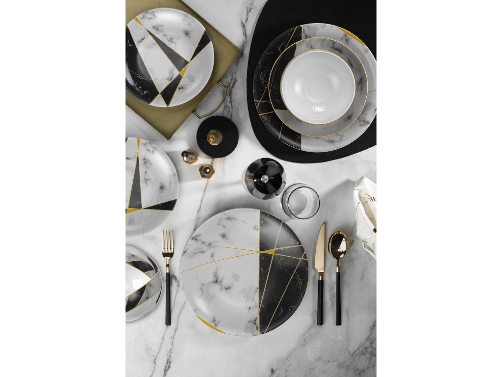 CUBE je sada talířů a misek, které mají na bílo-černém mramorovém podkladu zlaté žilkování.