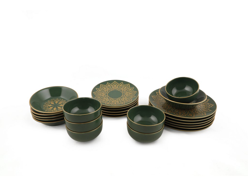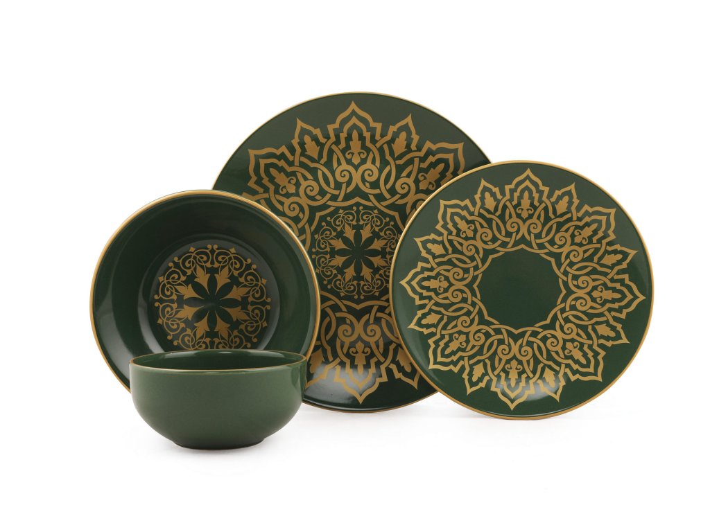 Porcelánová jídelní souprava PERSIA je složená ze čtyř sad talířů a misek, které mají na zeleném podkladu zlatou mandalovou kresbu a ozdobný lem téže barvy po obvodu každého kousku.