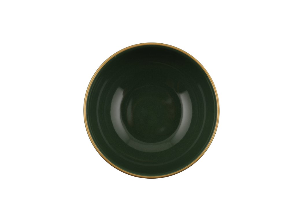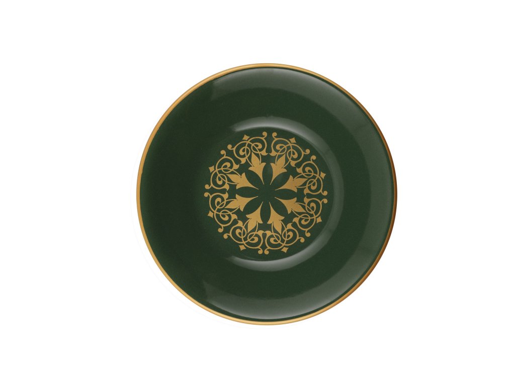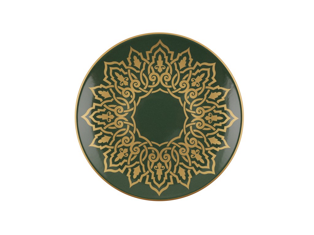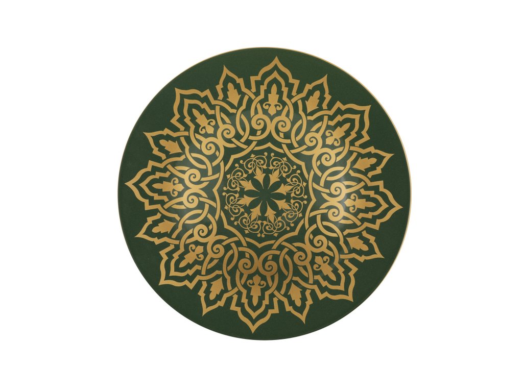PERSIA je souprava jídelního porcelánu zelené barvy, která je ozdobena zlatou mandalovou kresbou a doplněna po obvodu zlatým lemem.