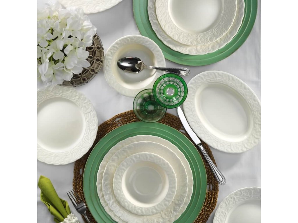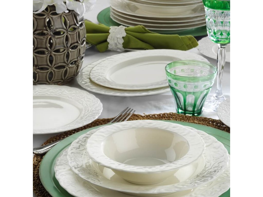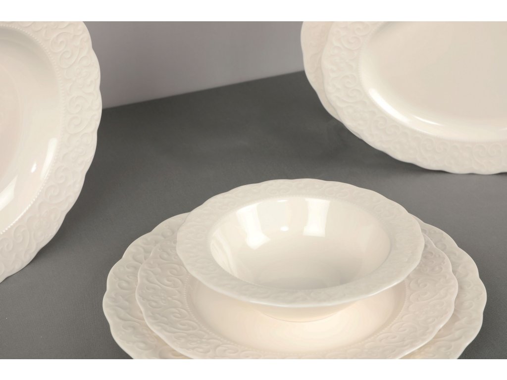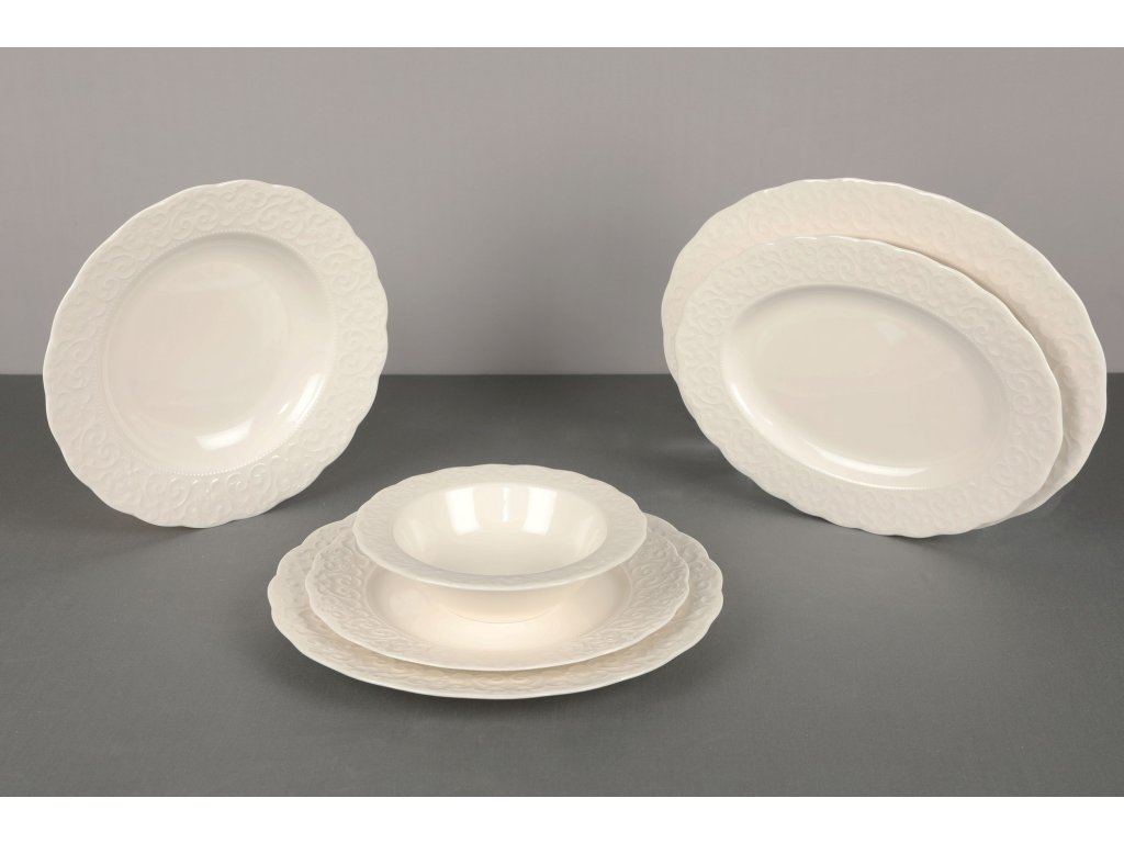 Souprava RUSTIK Vám nabízí pět druhů talířů a hluboké misky v bílé barvě s dekorativní plastickým lemem po obvodu každého kusu.
