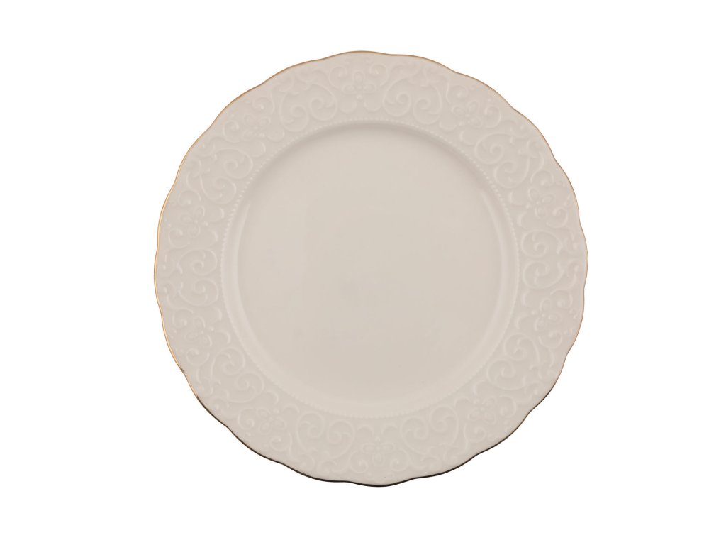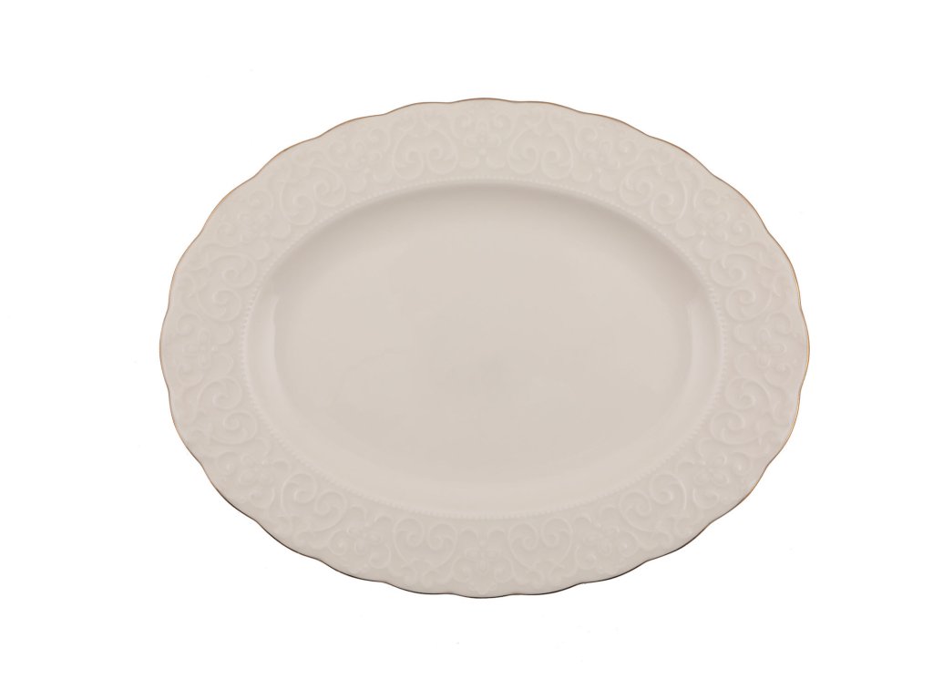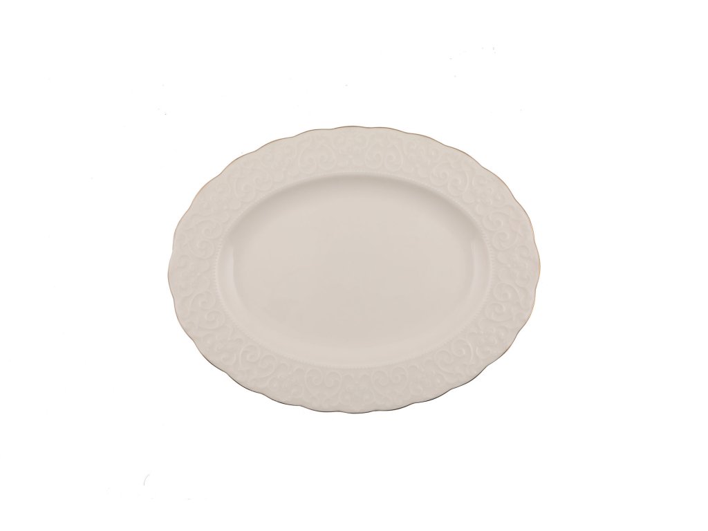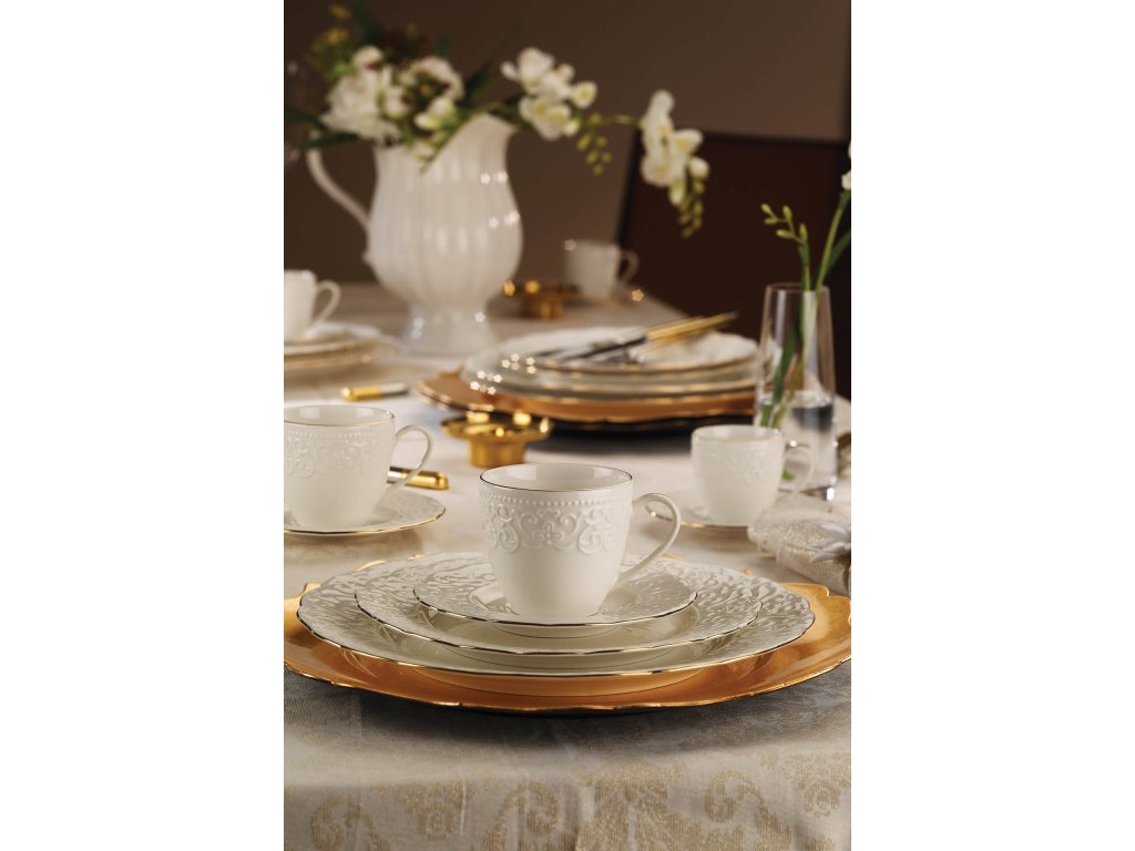 Je vyroben z čínského porcelánu krémové barvy s plastickým dekorativním lemem a zlatou linkou po obvodu každého kousku.