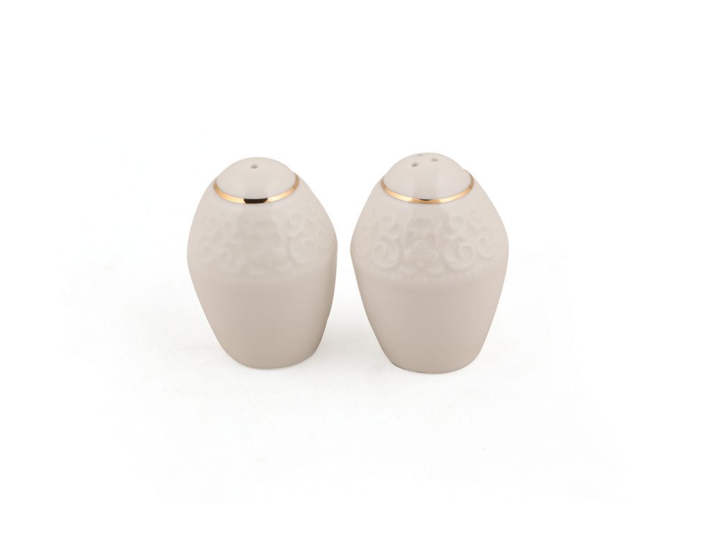Souprava RUSTIK GOLD Vám nabízí pět druhů talířů, misky, polévkovou mísu i šálky s podšálky, slánku s pepřenkou v krémové barvě s dekorativní plastickým lemem a zlatou linkou po obvodu každého kusu.