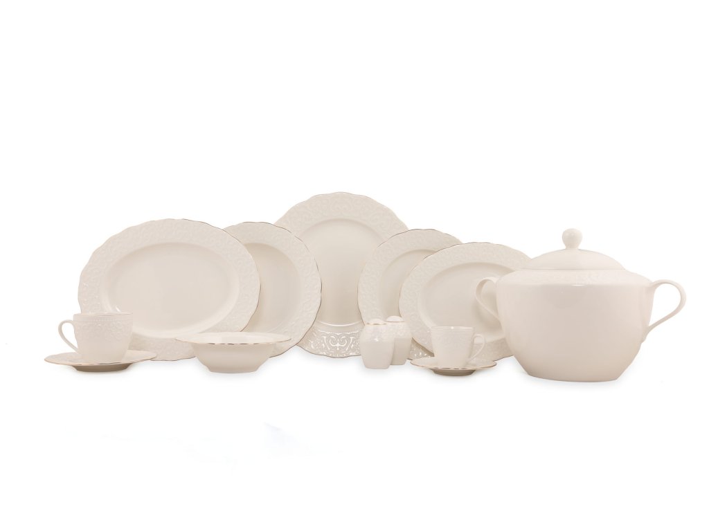 Porcelánová jídelní souprava RUSTIK GOLD se skládá z 81 kusů krémového porcelánu vhodného pro velké rodiny, nebo jako super obsáhlý servis pro oslavy.