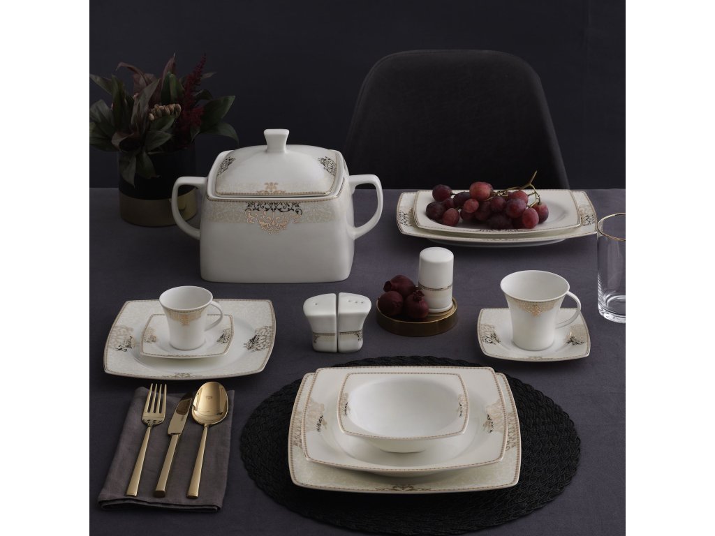 Porcelánová jídelní souprava SQUARE je sestavena z osmdesáti pěti kusů v bílé barvě se zlatým dekorem a lemováním.