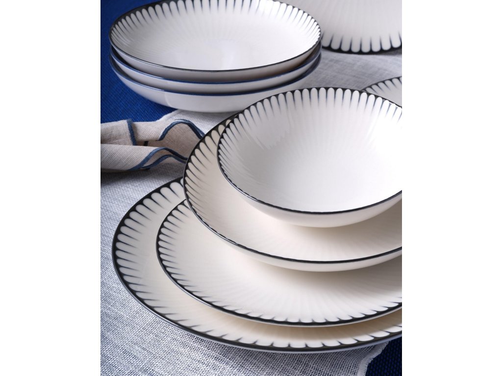 Jednoduchá porcelánová jídelní souprava Border kombinující bílou barvu a černé okraje