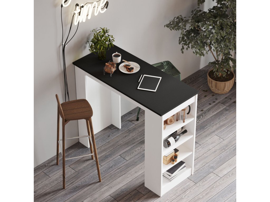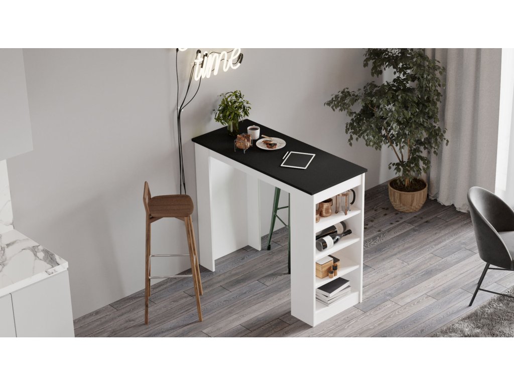 V bílo-černé barvě vyrobený barový stůl ST1 je nejen praktickým stolem, ale současně nabízí i úložné prostory.