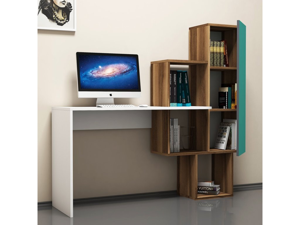 Psací stůl AÇELYA Vás na první pohled upoutá tyrkysovou skříňkou, která společně s dalšími třemi ořechovými regály tvoří pravou část stolu.