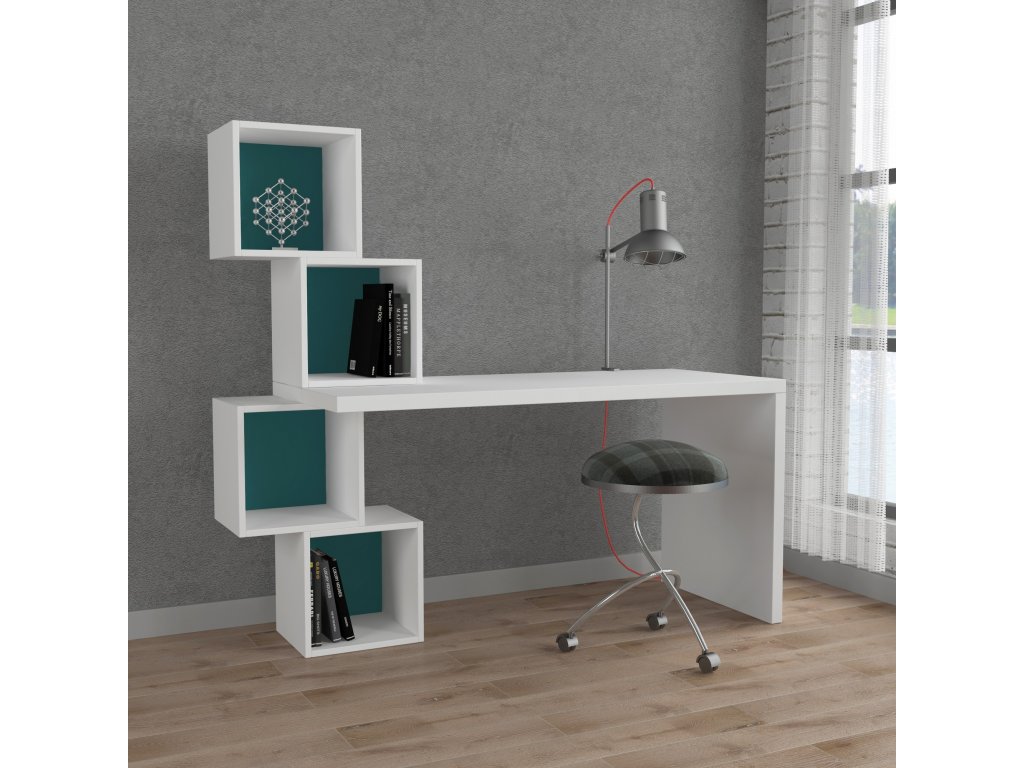 Bílý psací stůl BALANCE je tvořen pracovní deskou, jíž nese pravá bočnice a levou nahrazují čtyři čtvercových regály s tyrkysovou vnitřní zadní deskou.