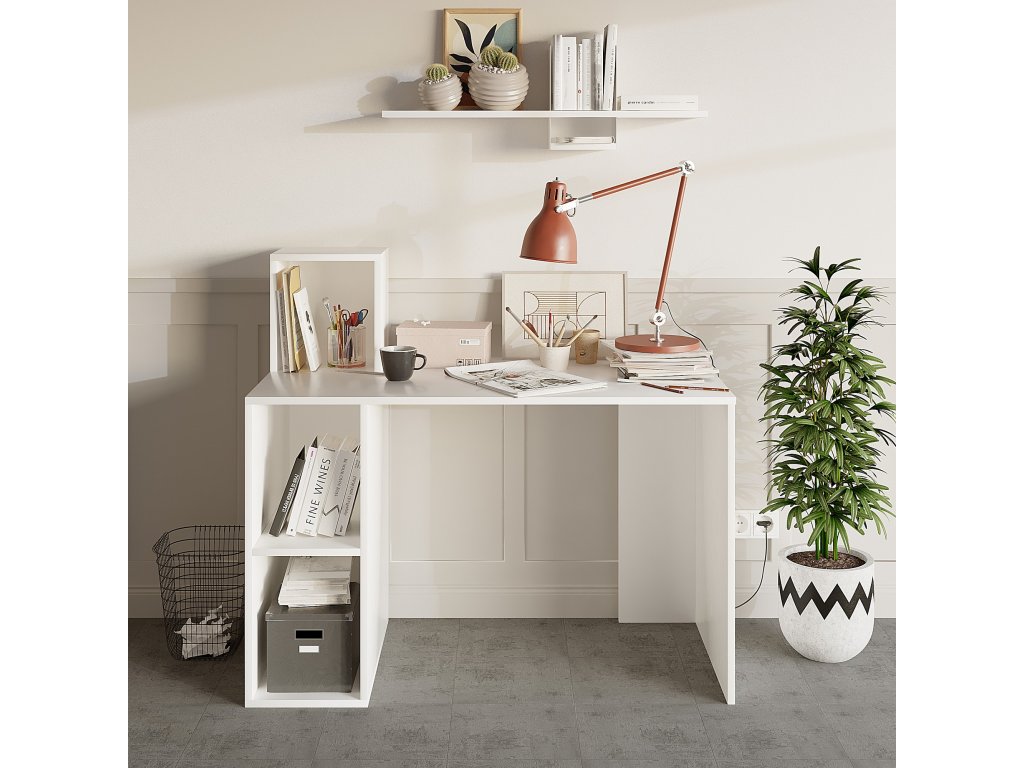 Psací stolek BUCA v bílém provedení doplněný o tři poličky.