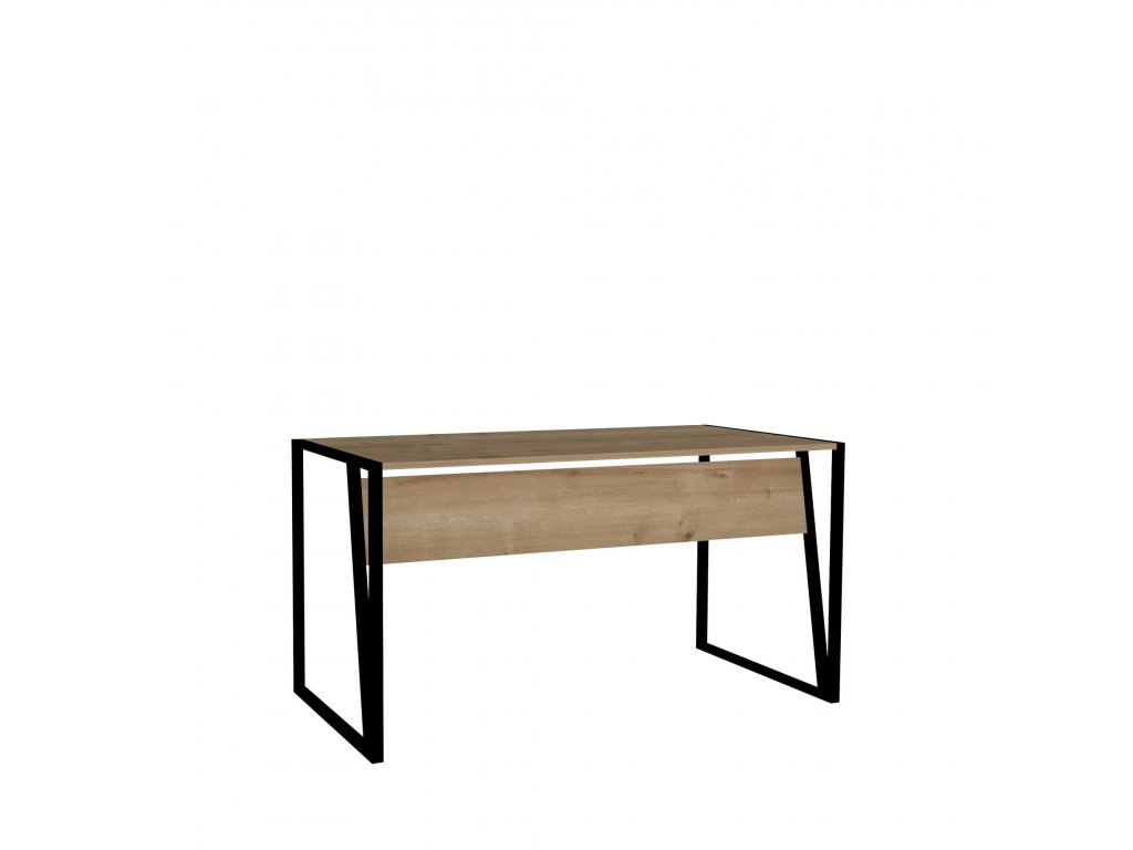 Psací stůl BZUNDA je vyrobený z desek v dekoru dub, které jsou ukotveny v černém kovovém rámu.