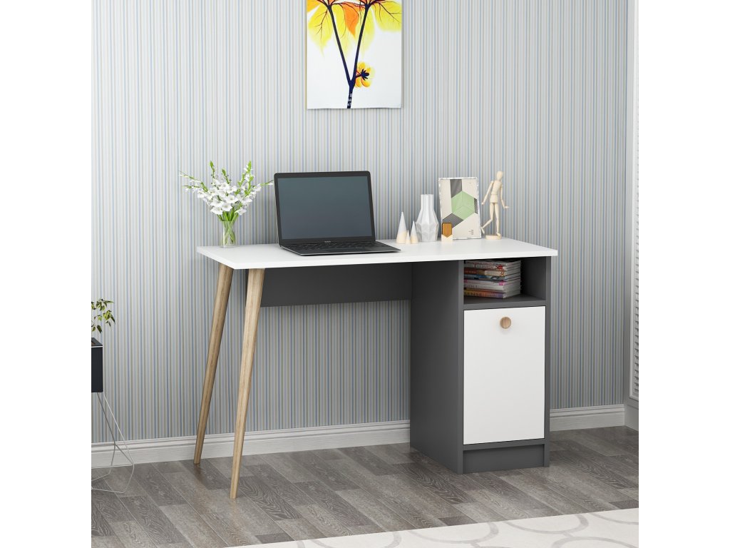 Antracitový psací stůl CANNAS stojí na dvou dřevěných nohách a další dvě jsou nahrazeny bílými dvířky uzavíratelnou skříňkou s regálem spojeným s bílou pracovní deskou.