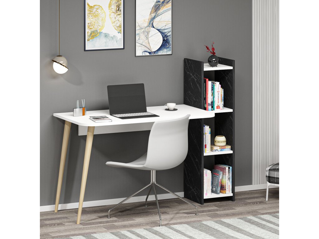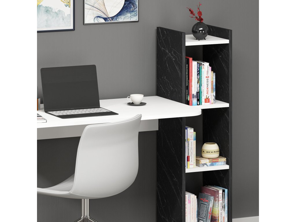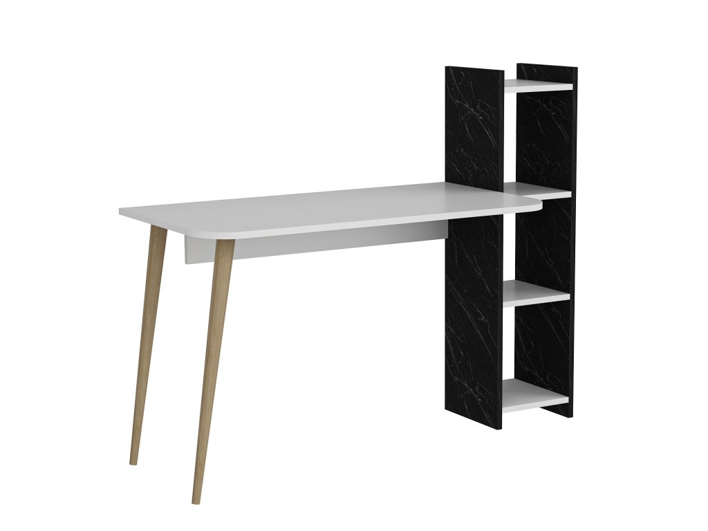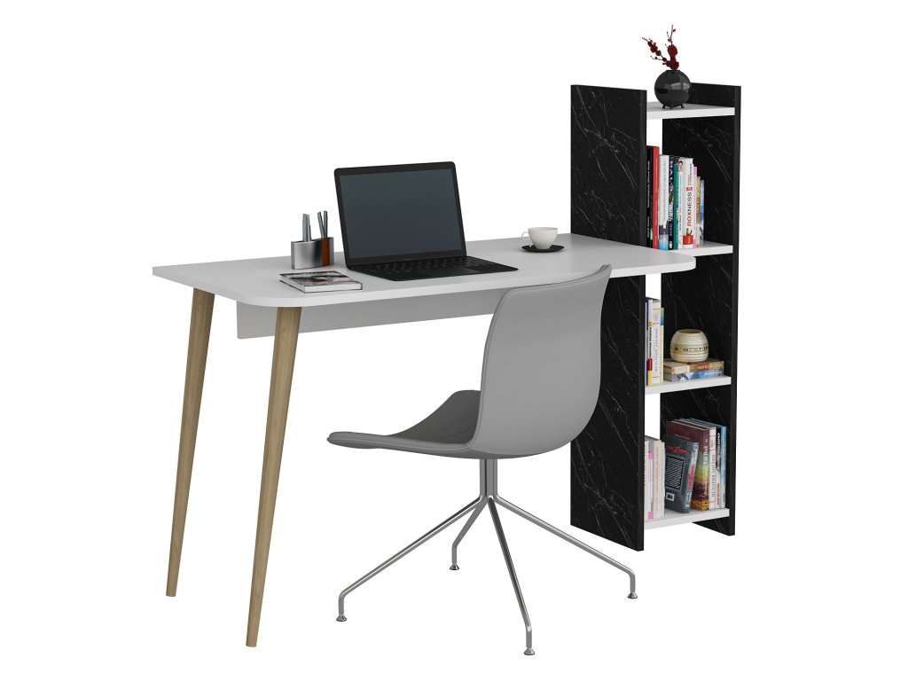 GLAXY je psací stůl, který až na vysoké dřevěné nohy nese bílou barvu a k němu je přidružena prostorná knihovna v dekoru černý mramor se třemi bílými regály.