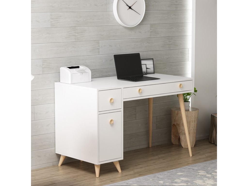 PC stůl v jednoduchém klasickém designu s praktickými zásuvkami v kombinaci bílé barvy a dekoru dubu.