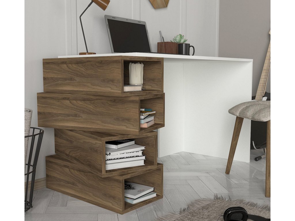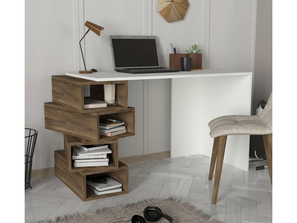 Stolek JENGA má velmi zajímavě řešené police, kvádry skládané zik zak na sebe a velkou pracovní plochu.