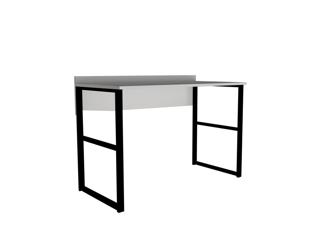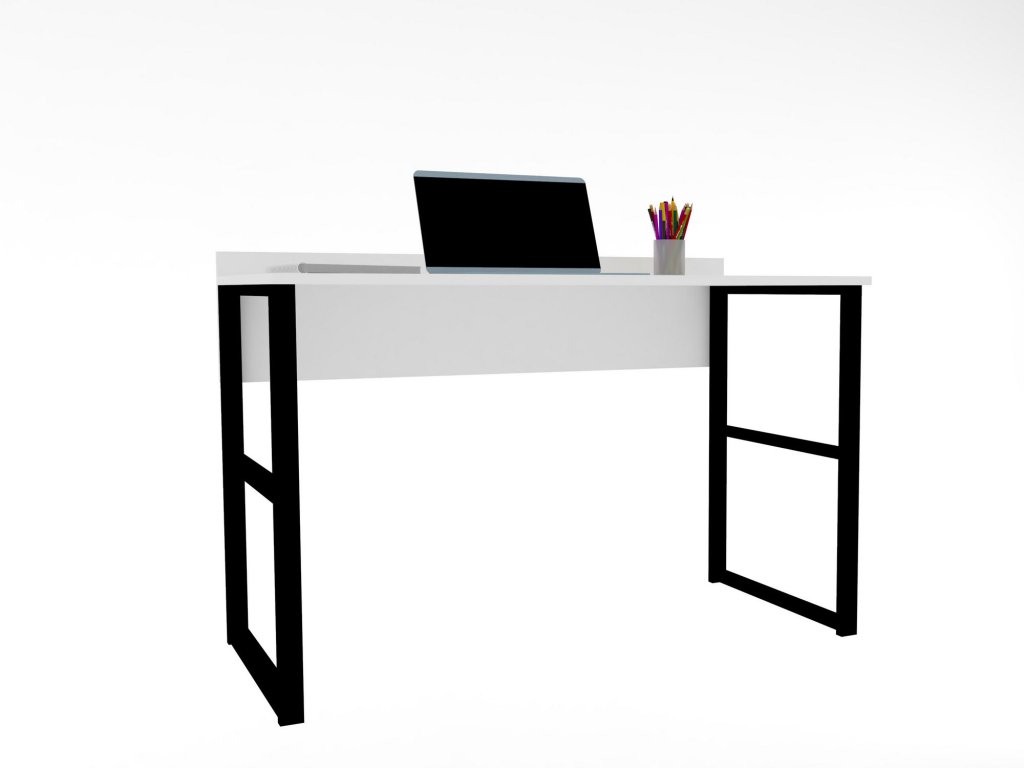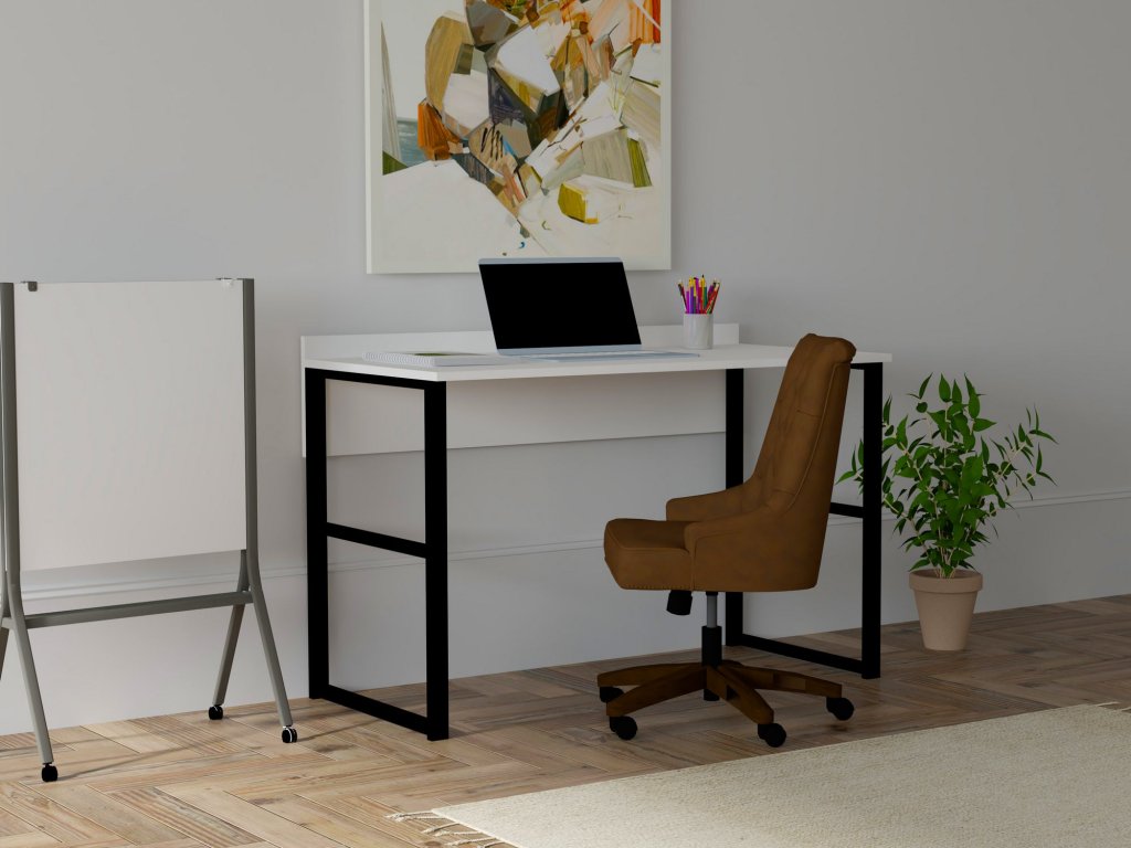 Na černých kovových rámech stojící psací stůl KAYRA má pracovní desku vyrobenou v kontrastní bílé barvě.