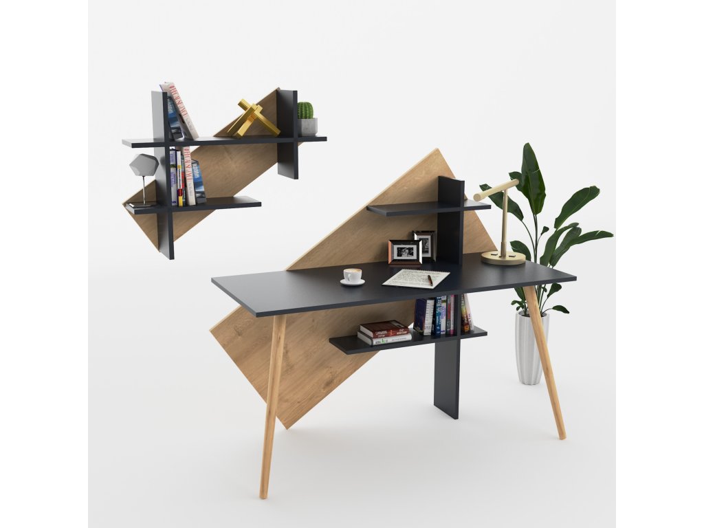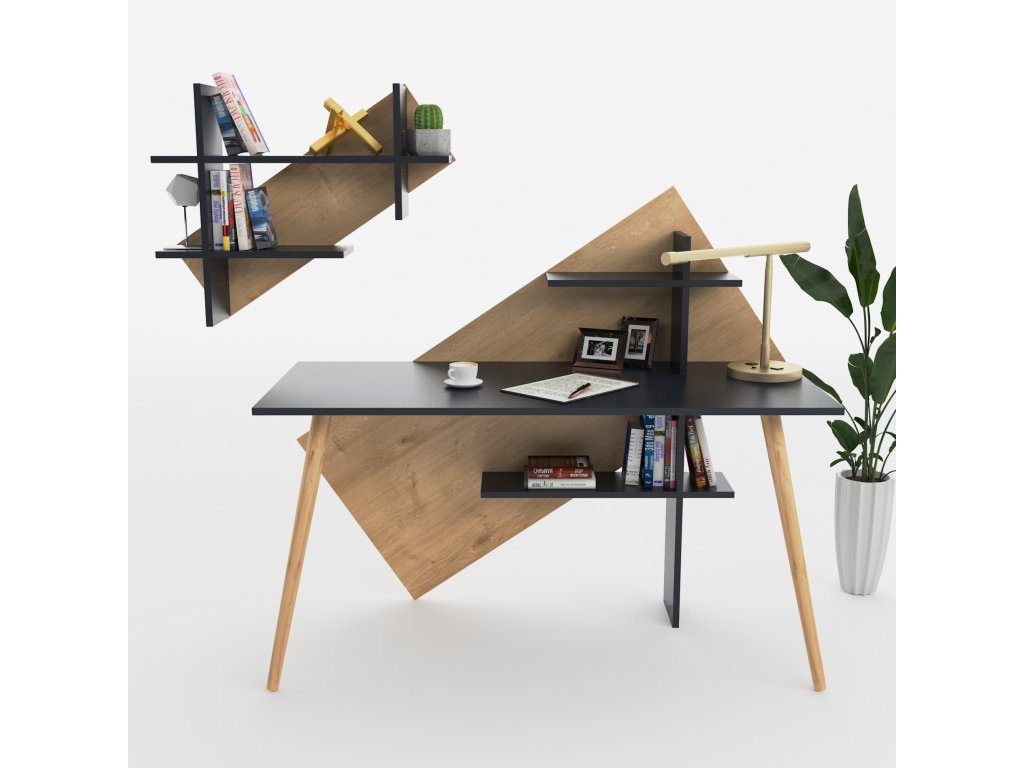 V dekoru dub vyrobený psací stůl LAGOMOOD je sestaven ze dvou velkých desek, z nichž antracitová slouží jako pracovní deska a ta dubová jakoby byla zachycena v pádu a tvoří tak zadní stěnu, na kterou jsou usazené další antracitové vodorovné police nabízející úložný prostor. Stejný design se objevuje i na příslušné nástěnné polici.