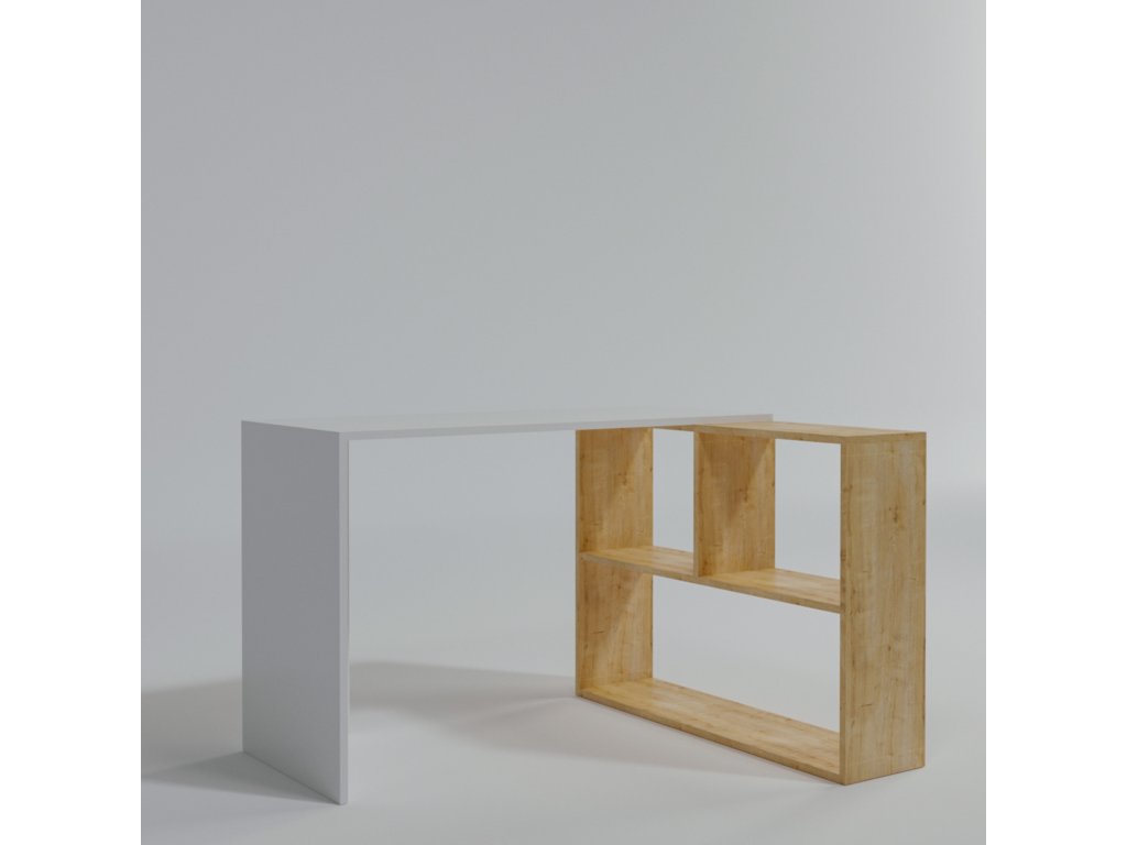 Praktický rohový stůl MASAI s policovým úložným prostorem v provedení dub s bílou.