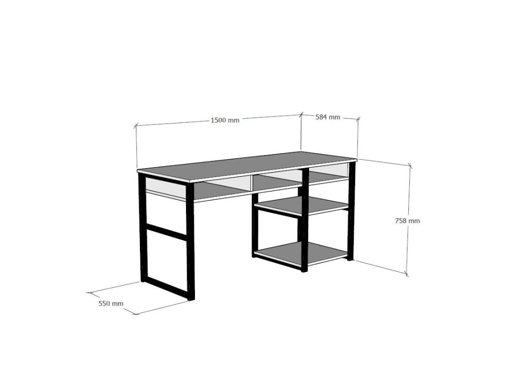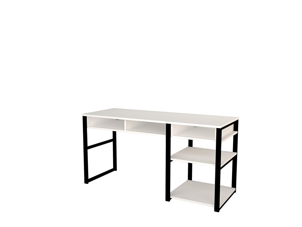 Moderní psací stůl SERHO je vyroben v industriálním stylu z kovové konstrukce, která drží bílou desku a pod ní tři otevřené regály a v pravé noze i dvě odkládací police.