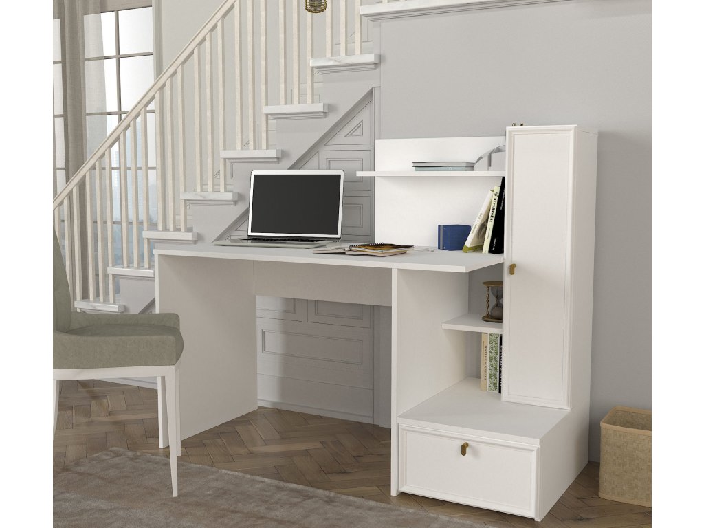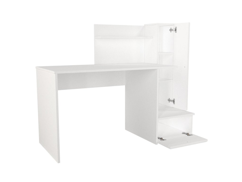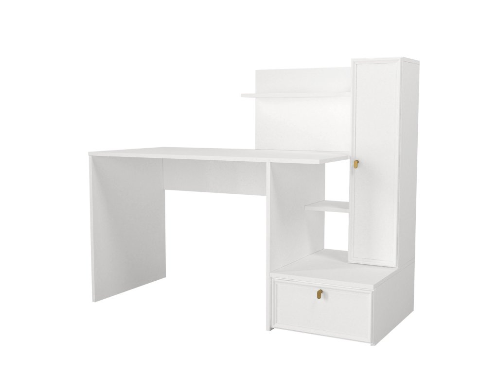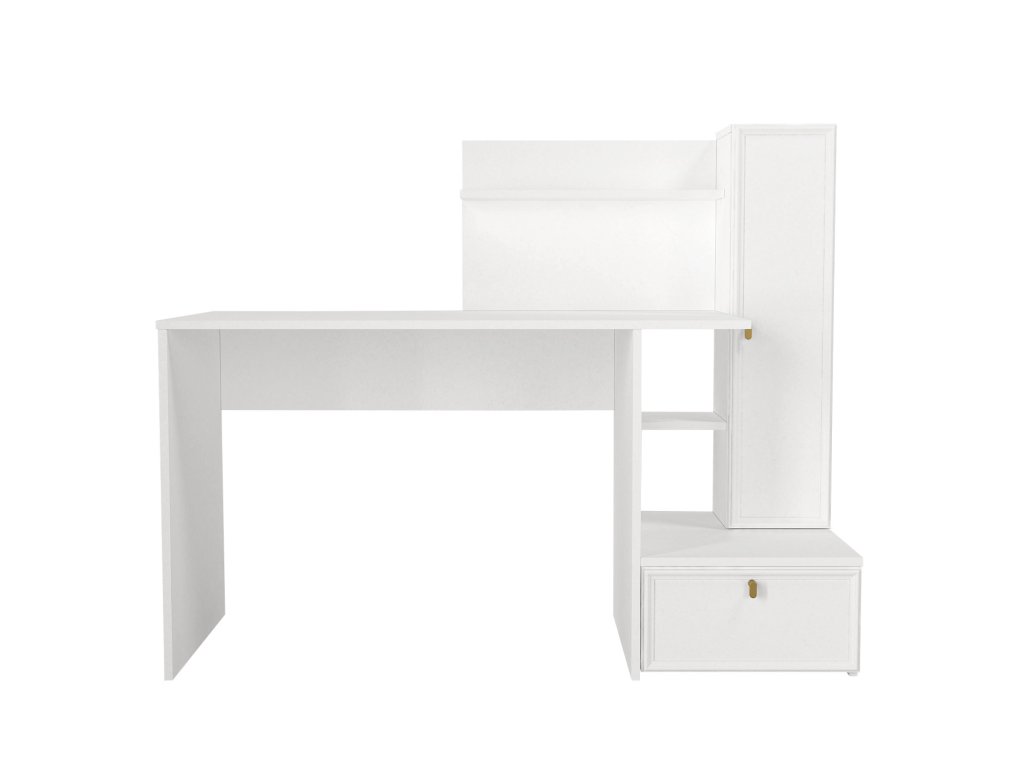 Bílý psací stůl SHELLON má pro svého uživatele k dispozici pracovní desku, čtyři volné odkládací police a dvě skříňky.