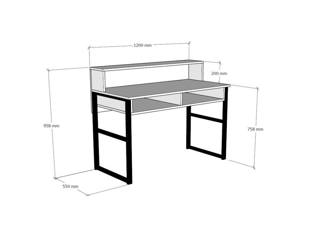 Je vyrobený z 18 mm silných desek pokrytých 100 % melaminem v bílé barvě a z černých kovových rámů.