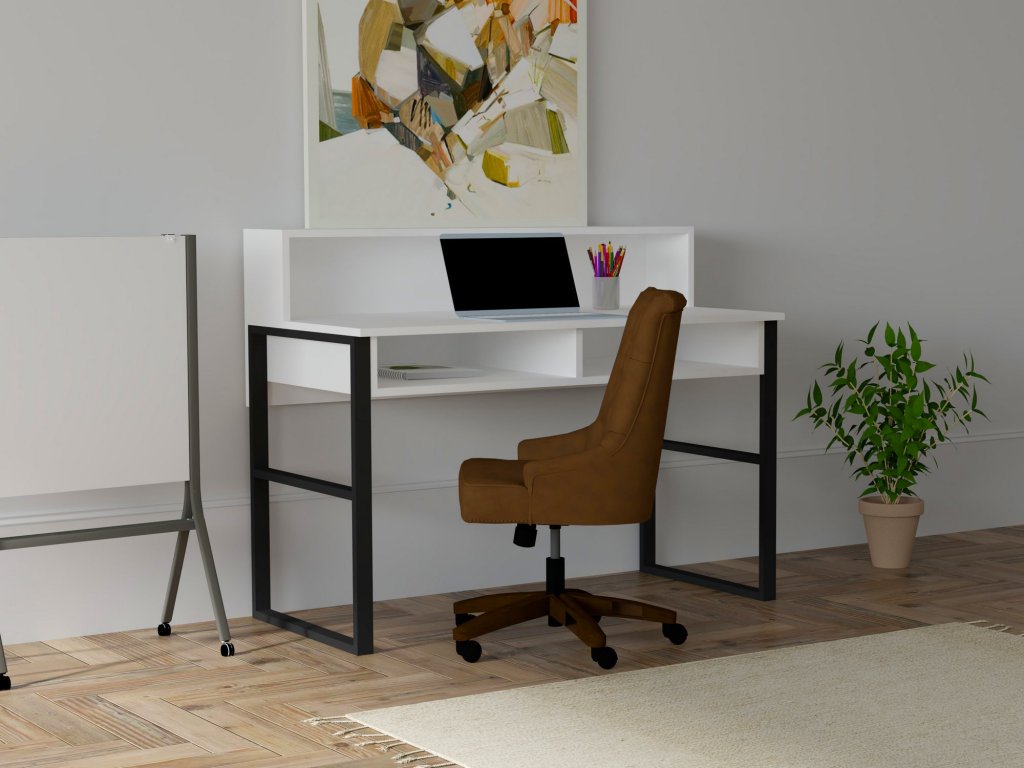 Na černých kovových rámech stojící psací stůl ZAKKUM je vybaven pracovní i odkláýdací deskou vyrobených v kontrastní bílé barvě.