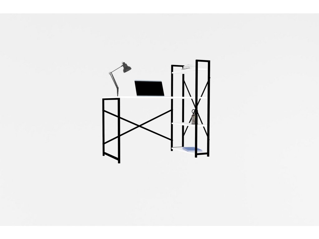 Moderní psací stůl ZERNEZ je vyroben v jemném industriálním stylu z černé kovové konstrukce, která drží bílou pracovní desku a kolmo k ní další tři odkládací police.