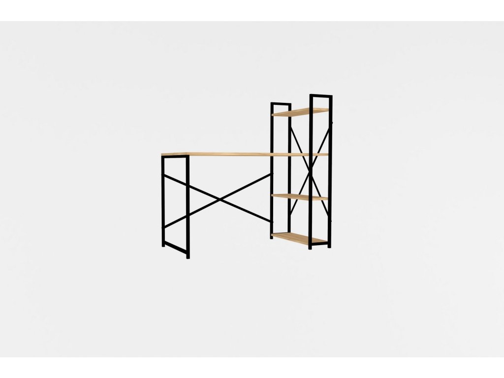 Moderní psací stůl ZERNEZ je vyroben v jemném industriálním stylu z černé kovové konstrukce, která drží v dekoru dub sapphire vyrobenou pracovní desku a kolmo k ní další tři odkládací police.