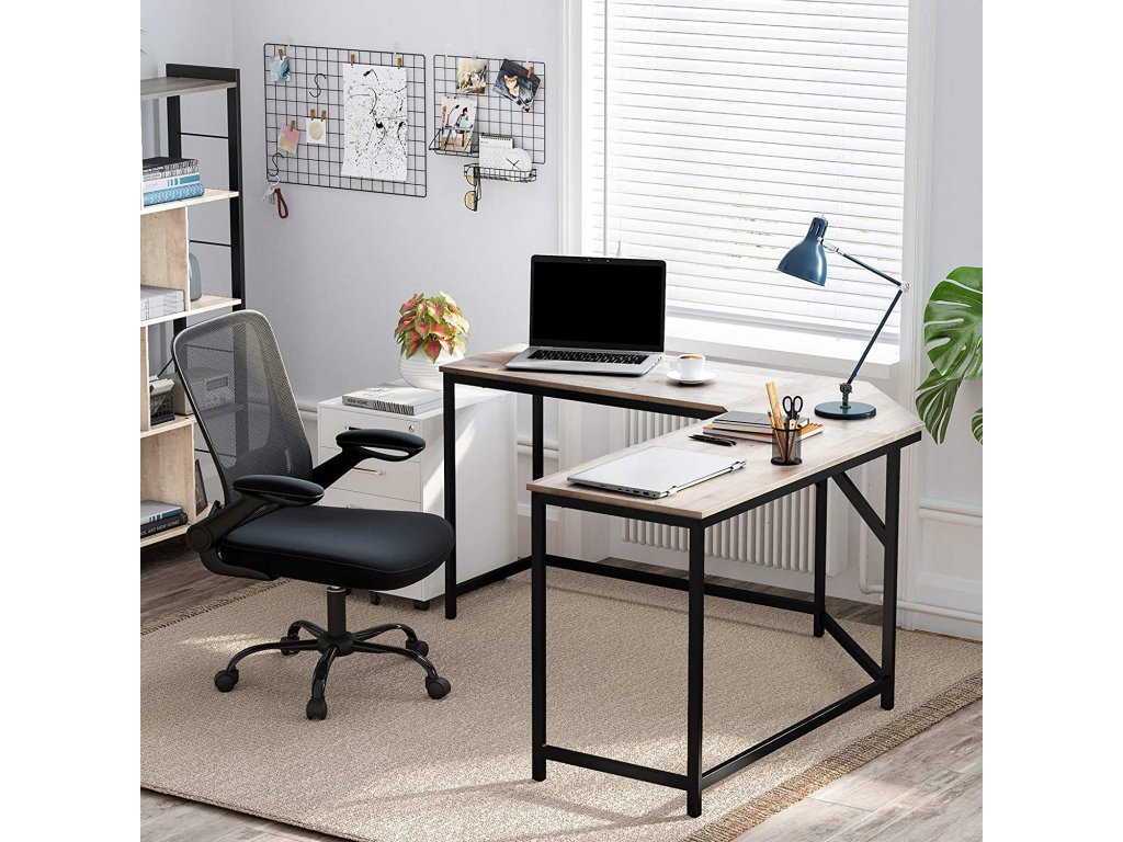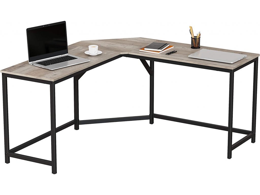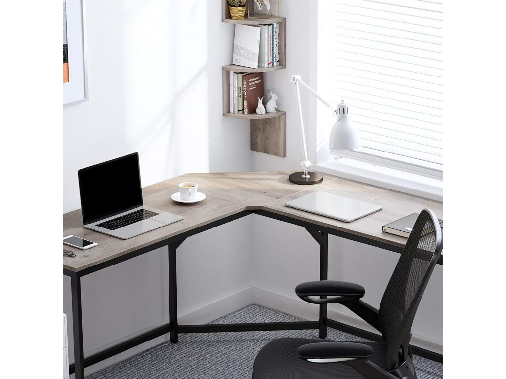 Rohový psací stůl ve tvaru písmene L v industriálním designu má mnohostranné využití doma i v práci.