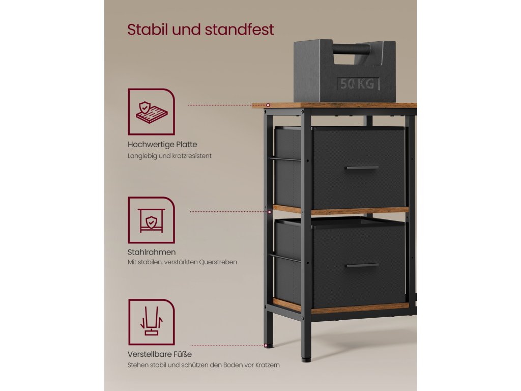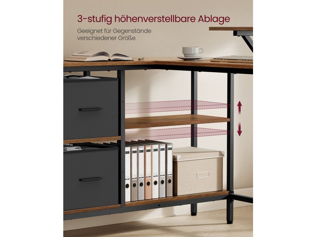 Rohový stůl s 2 prostornými úložnými zásuvkami nabízí dostatek místa pro složky a kancelářské potřeby. Střední police je nastavitelná do 3 výškových úrovní, aby vyhovovala vašim požadavkům na úložný prostor.