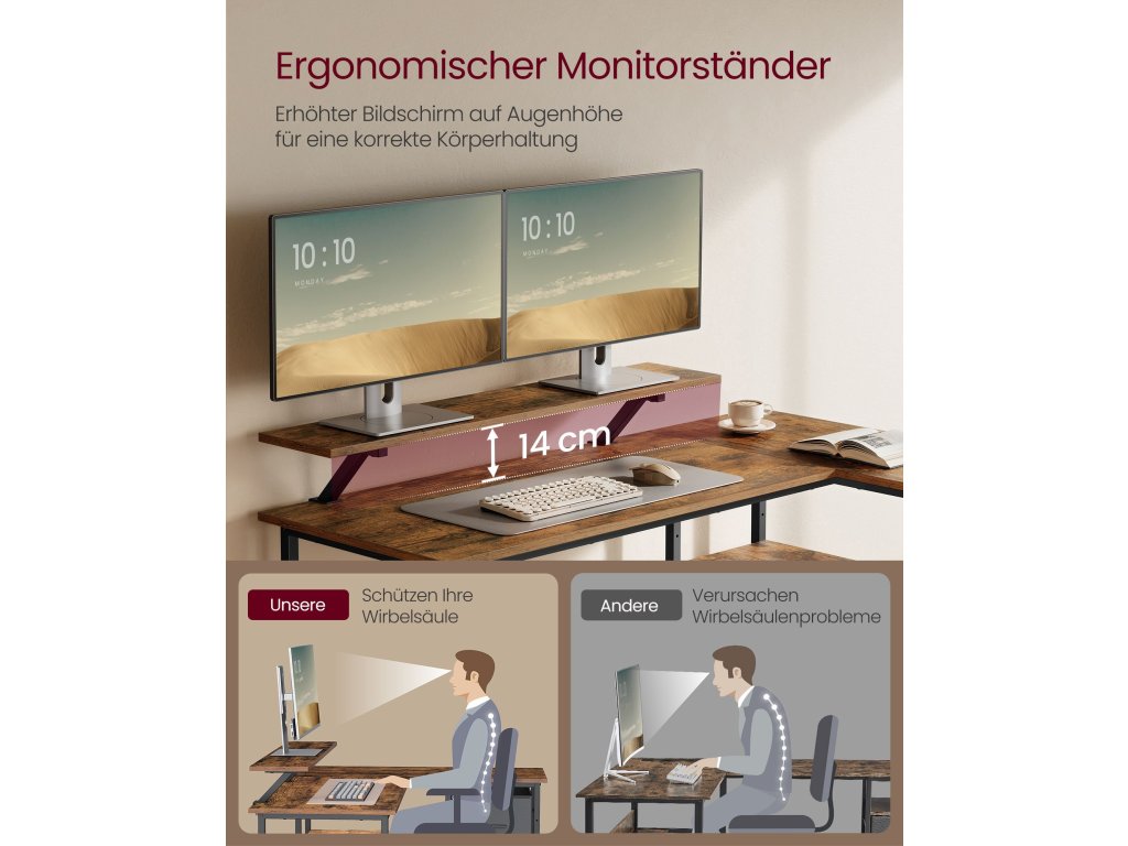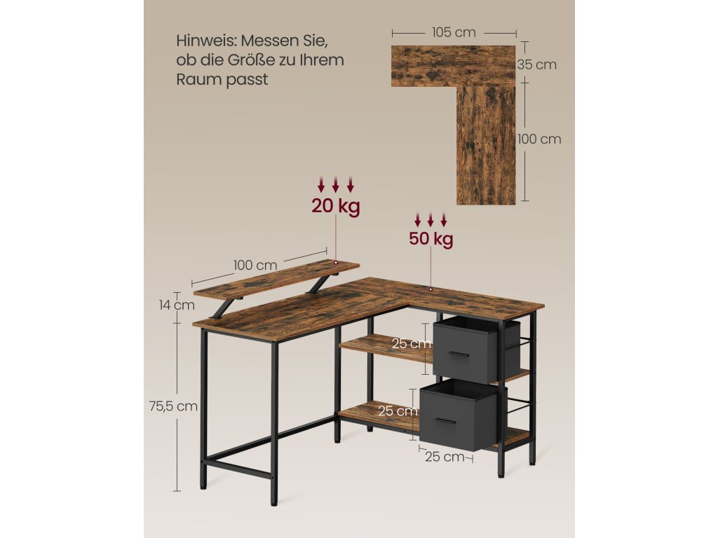 Stůl ve tvaru L o rozměrech 105 x 135 x 89,5 cm má oboustranný design, který vám umožňuje instalovat zásuvky na levou nebo pravou stranu, takže se perfektně hodí do jakéhokoli rohu vaší domácí kanceláře, ložnice nebo obývacího pokoje.