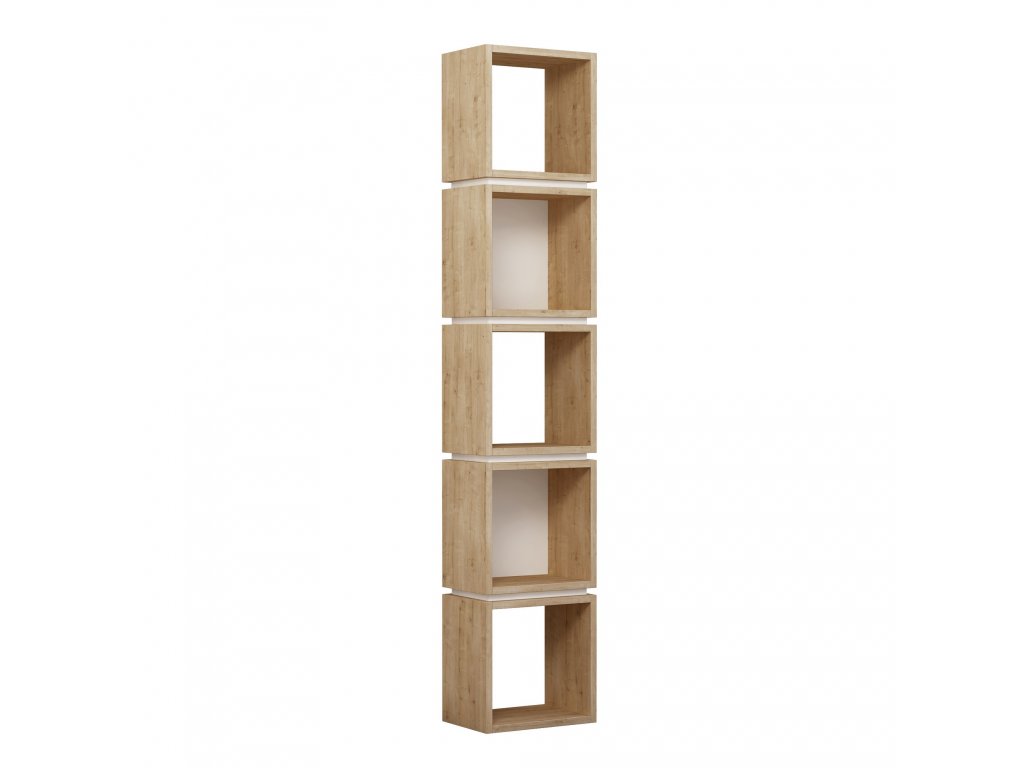 Do sloupce navršené čtvercové regály se zády nebo bez, s dekorem dubu a bílou linií jsou doménou knihovny MULTI.
