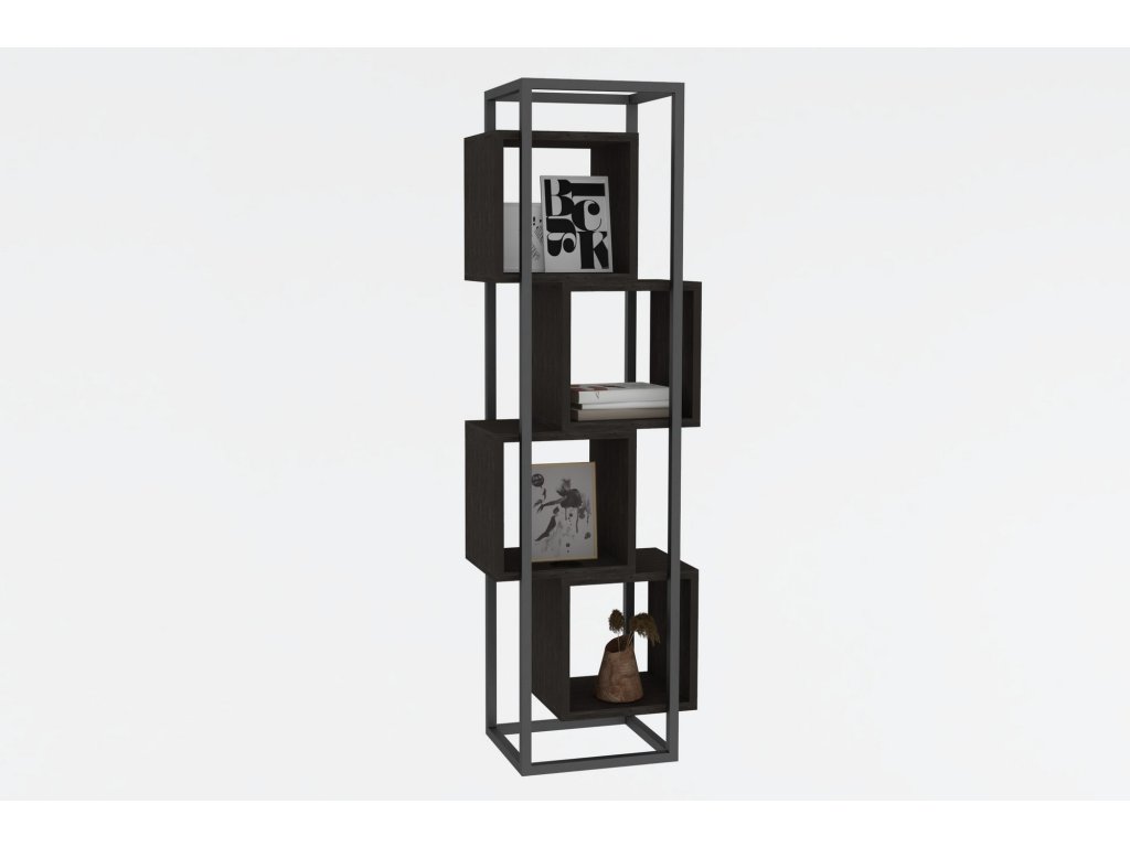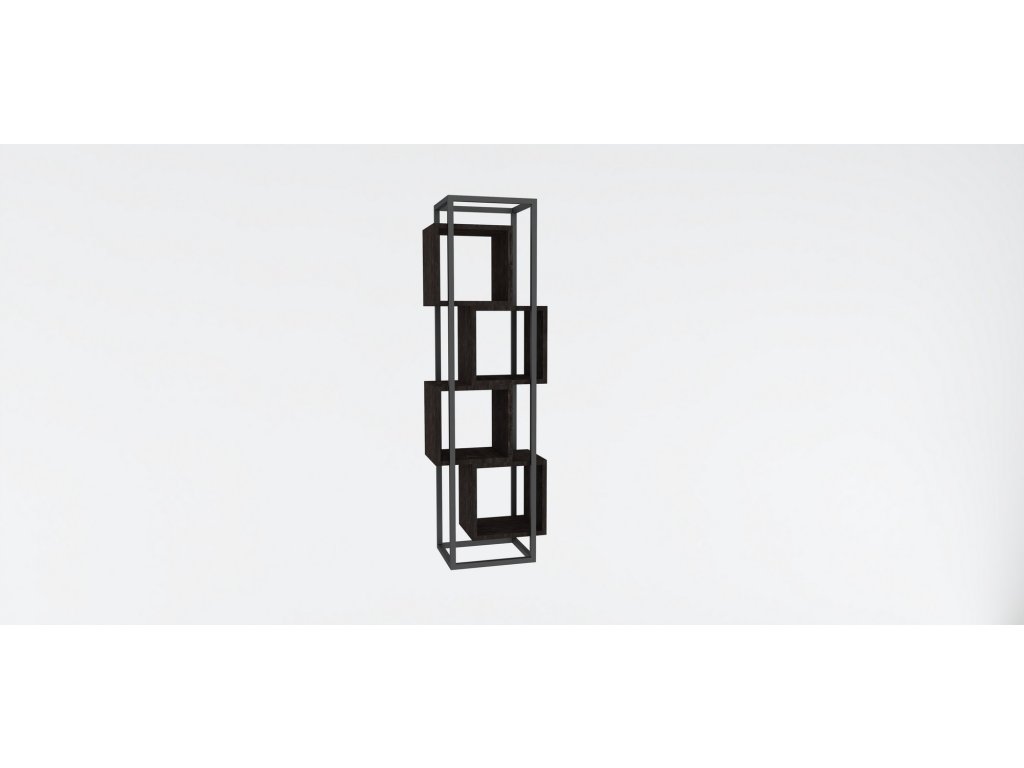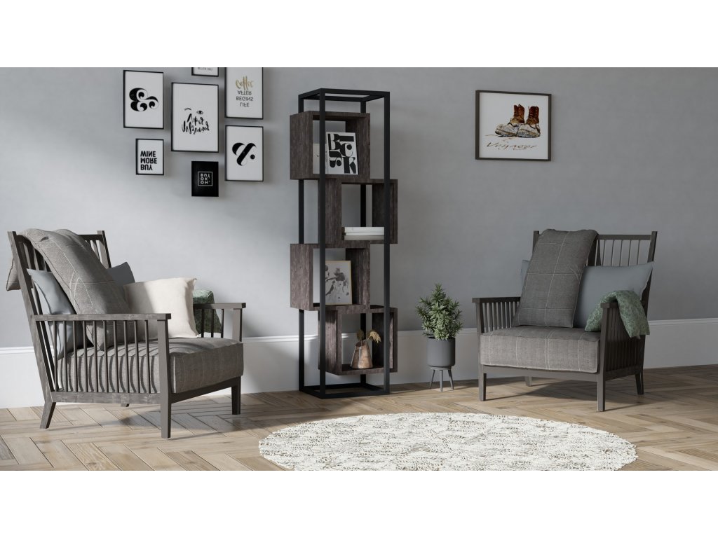 Knihovnu RABANT tvoří šedý úzký rám, do nějž jsou vsazené čtyři antracitové čtvercové regály.