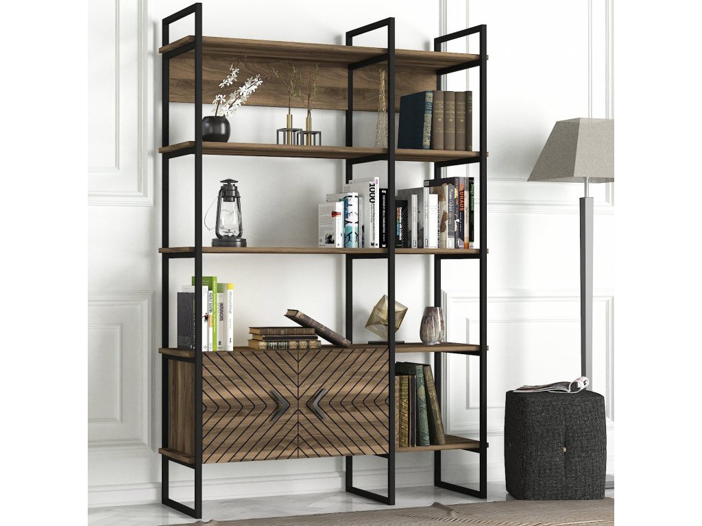 Regálová knihovna kombinuje kovový rám a police v dekoru ořechového dřeva a je doplněna uzavíratelnou skříňkou