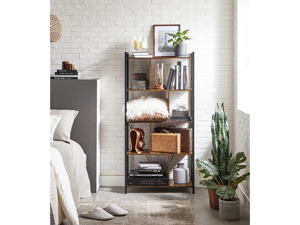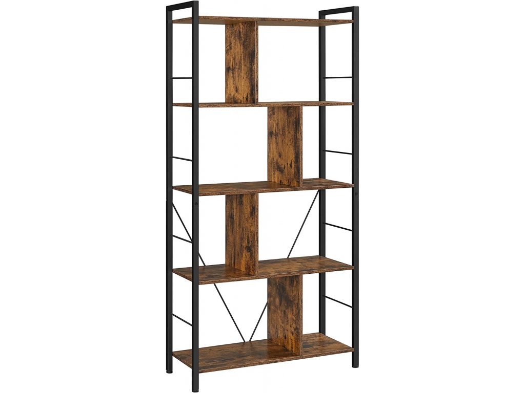 Industriální regál tvořený černým kovovým rámem, který je podpůrnou konstrukcí pro čtyři police s příčkami v rustikální hnědé barvě.