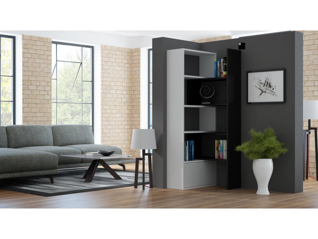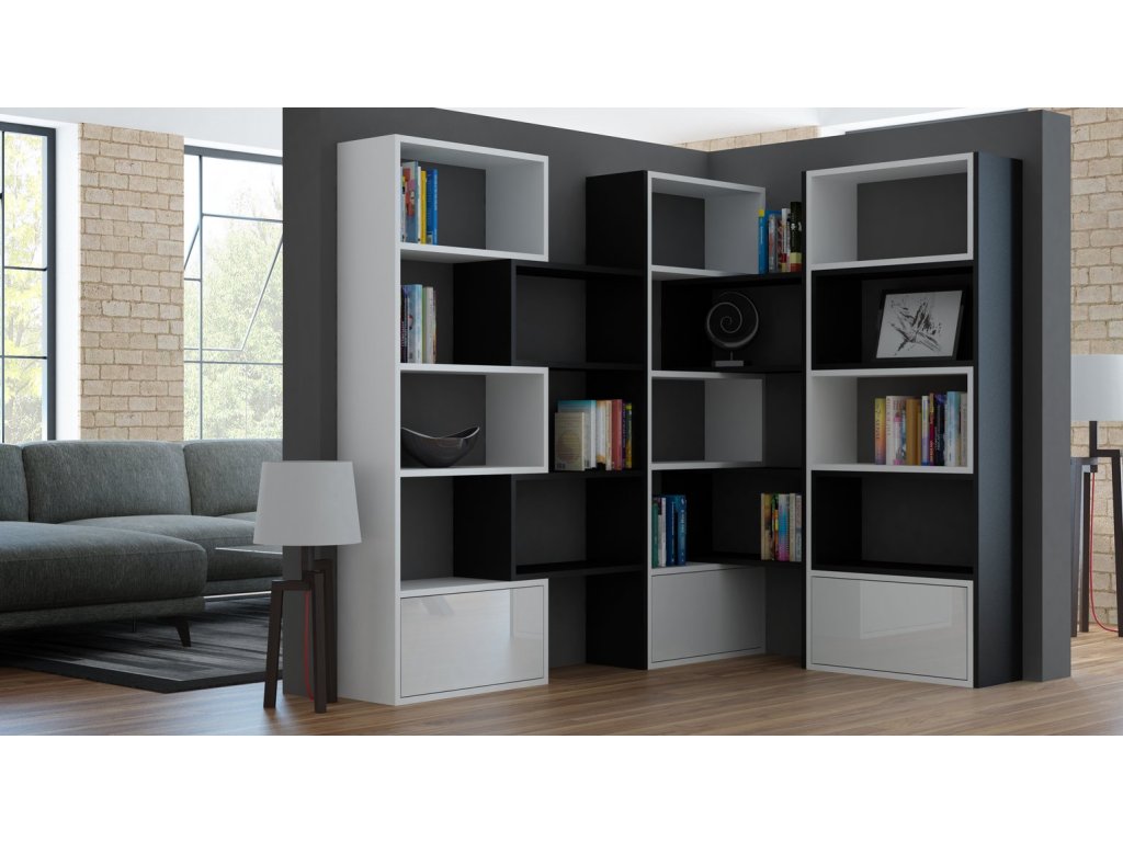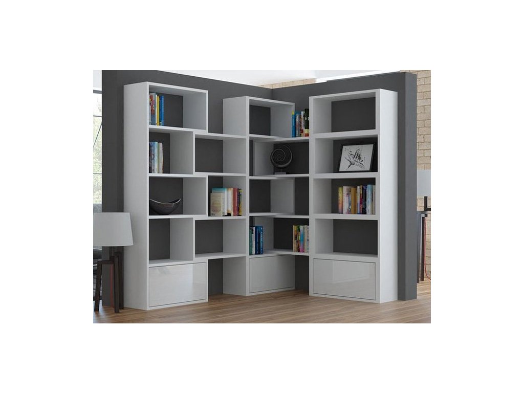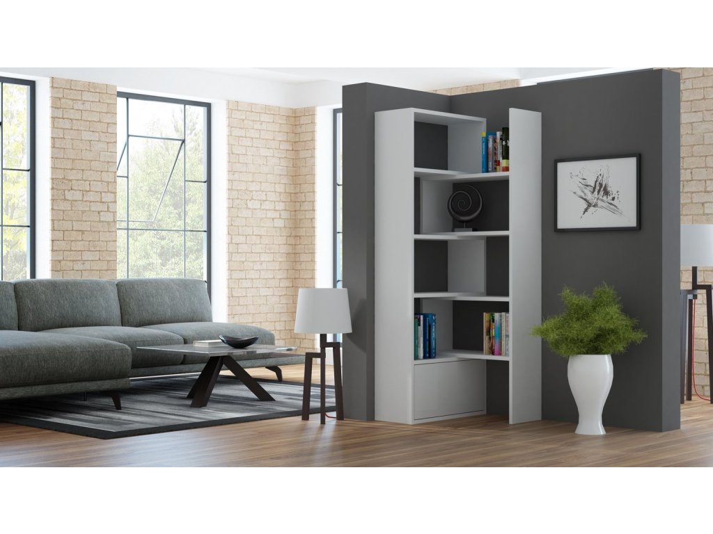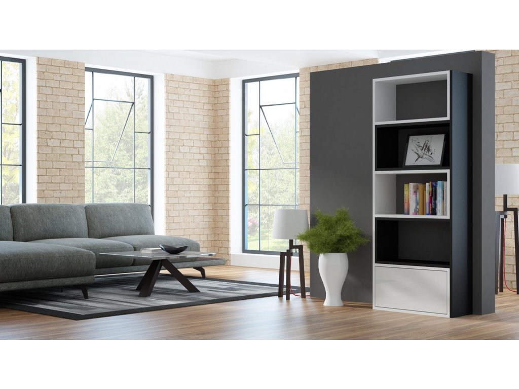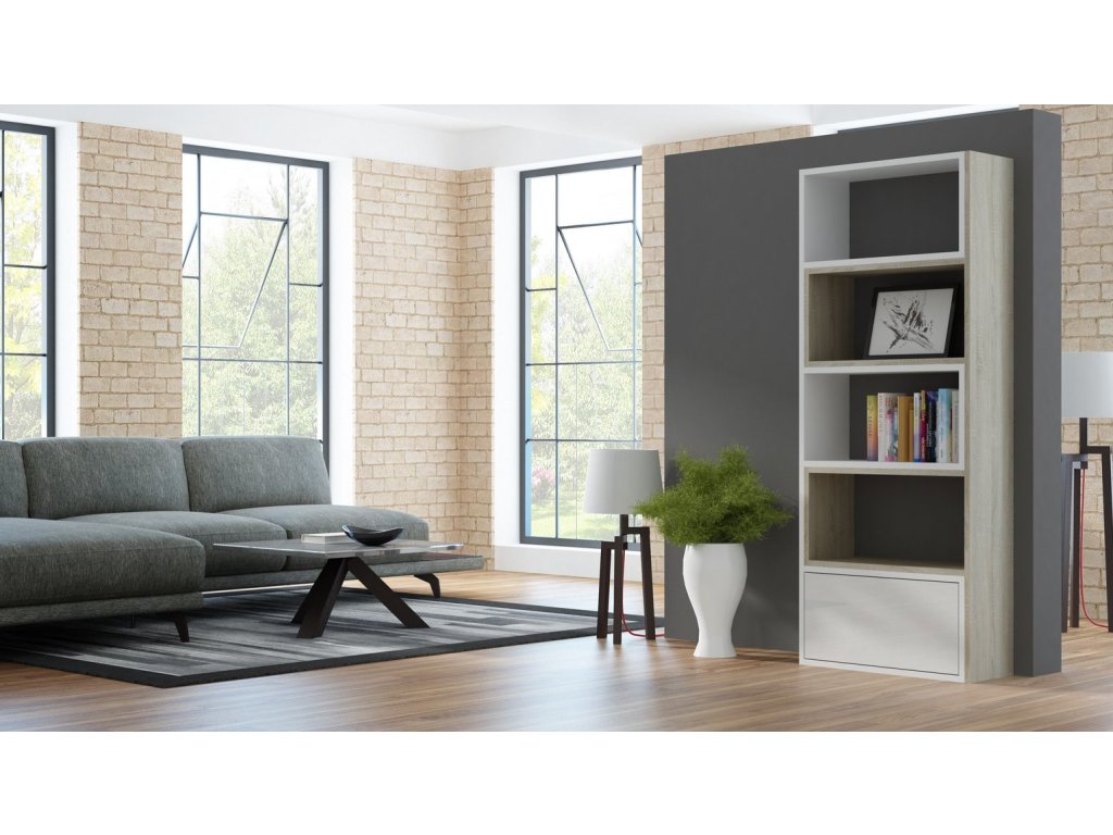 Moderní policový regál-knihovna v bílém provedení v kombinaci s dub sonoma