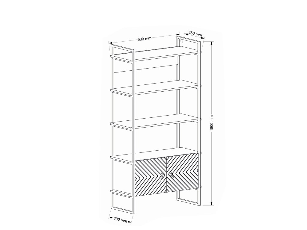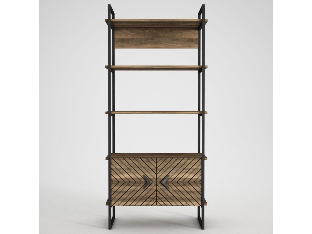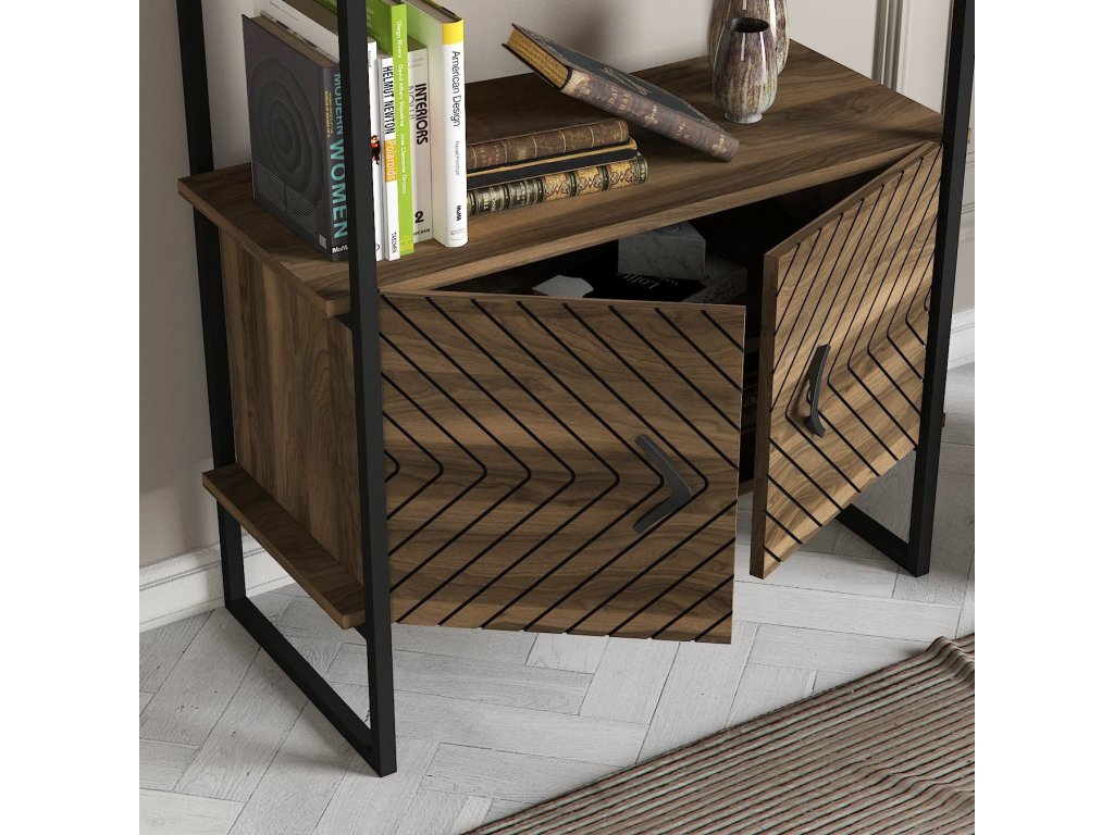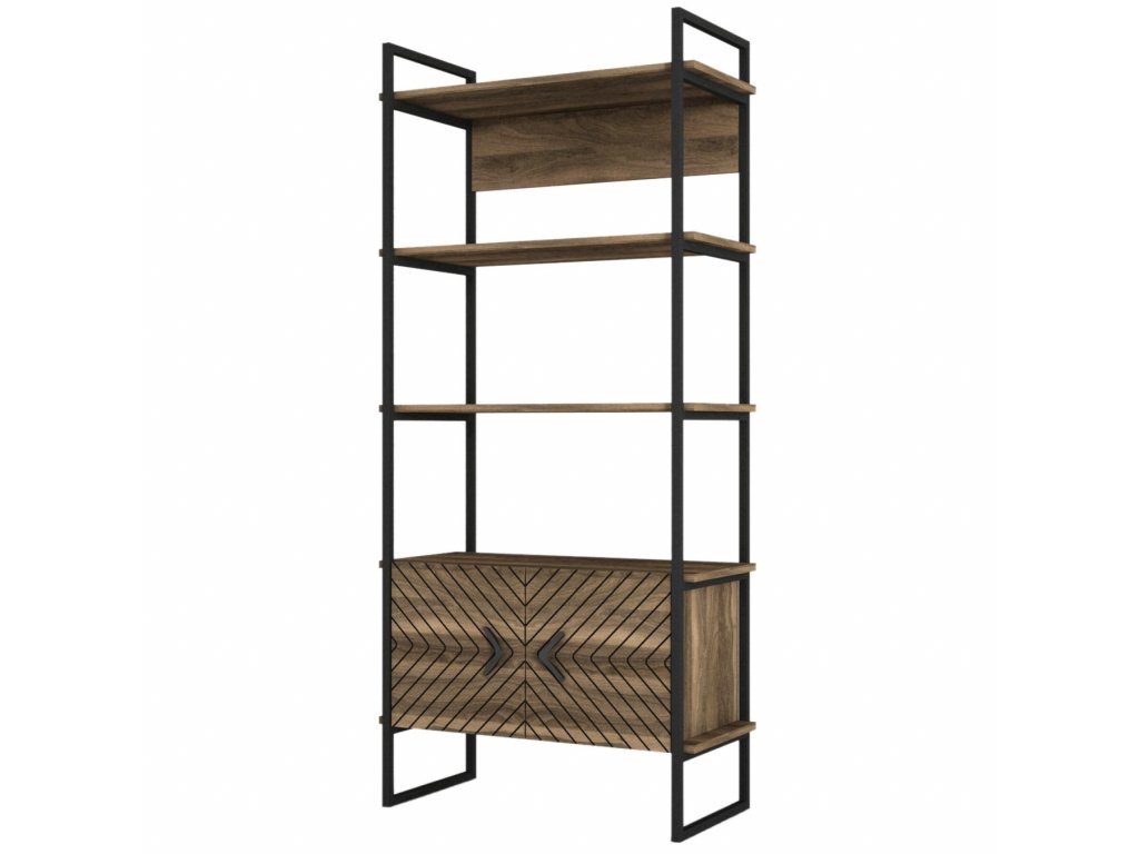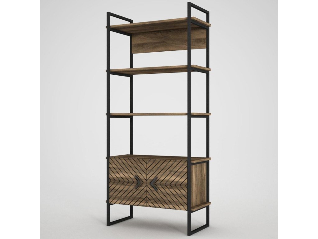 Tento regál nabízí také úložný prostor s klasickými dvířky s rýhováním a zajímavými úchytkami.