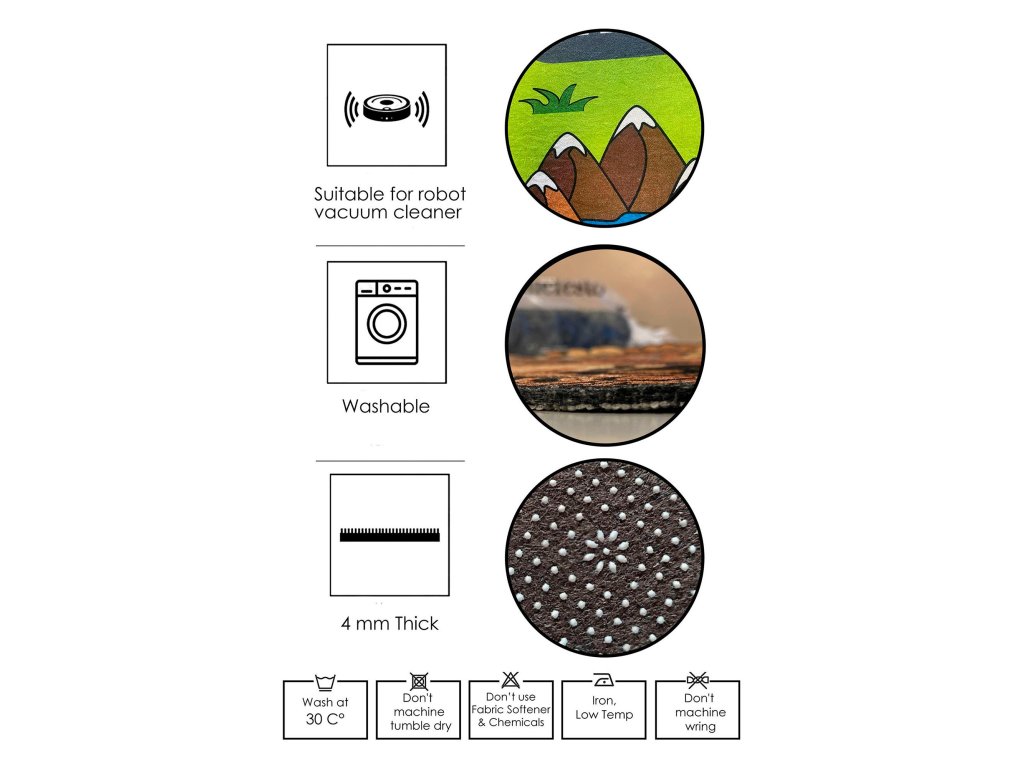 Náš koberec je nejen krásný, ale také praktický. Je antibakteriální, což zajišťuje čisté a zdravé prostředí pro vás i vaše blízké. Protiskluzová spodní strana z PVC a bodový podklad zajišťují větší bezpečnost a zabraňují nechtěnému uklouznutí nebo pádu.