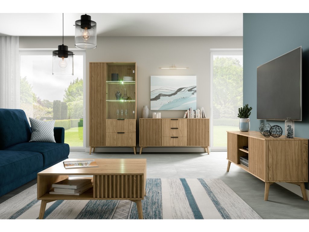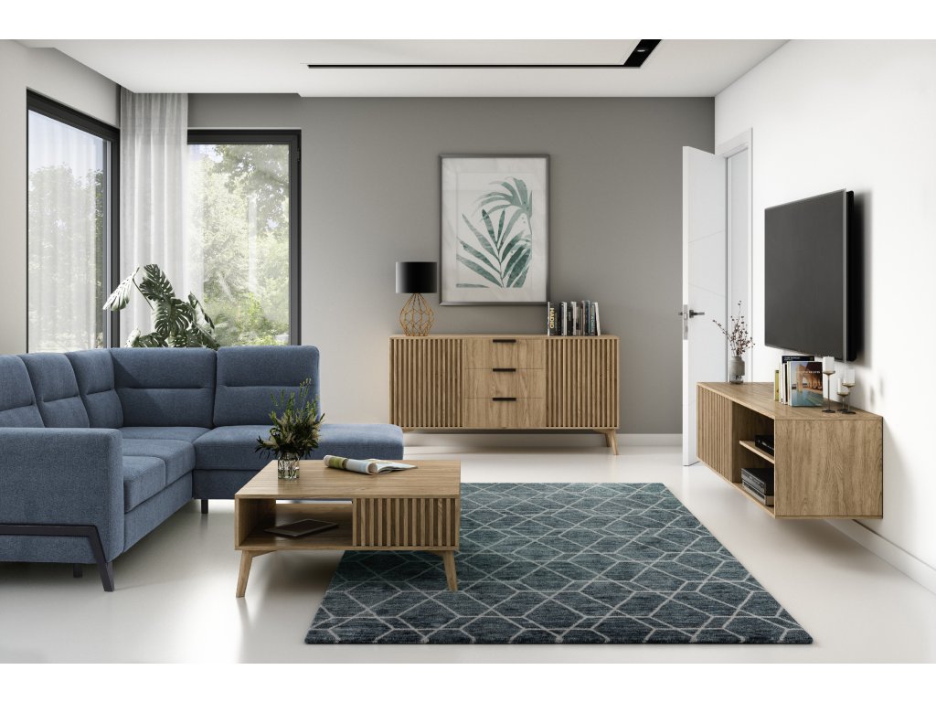 Komoda s nadčasovým přírodním designem a praktickým úložným prostorem o třech zásuvkách a dvou policích.