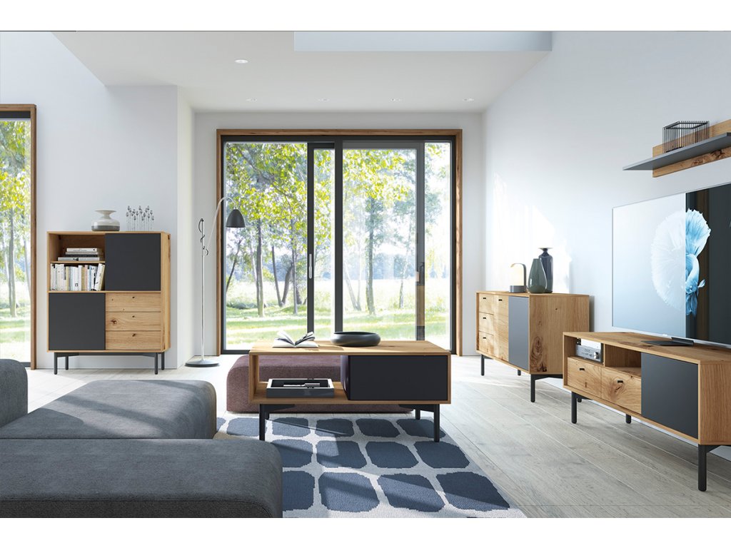 Kombinovaná komoda HAGIA v dekoru dubu a černé z kolekce HAGIA - zásuvky police i skříňky v jednom