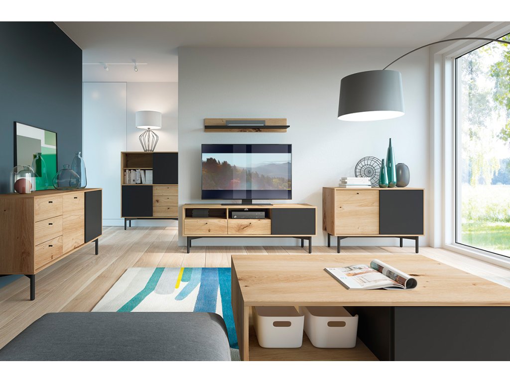 Moderní komoda v dekoru dubu a s černými prvky z kolekce HAGIA - elegantní a originální vzhled