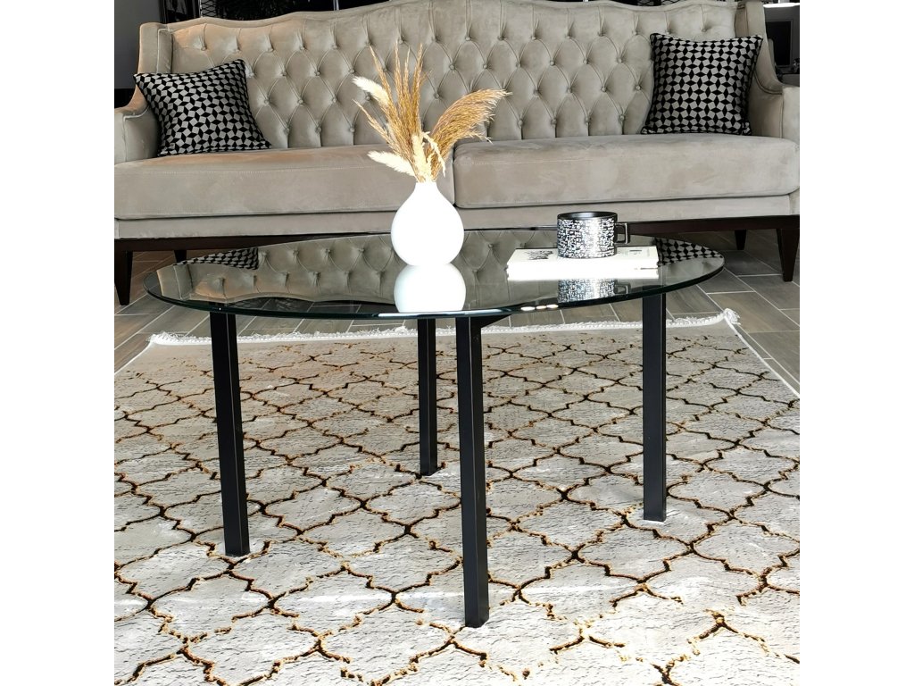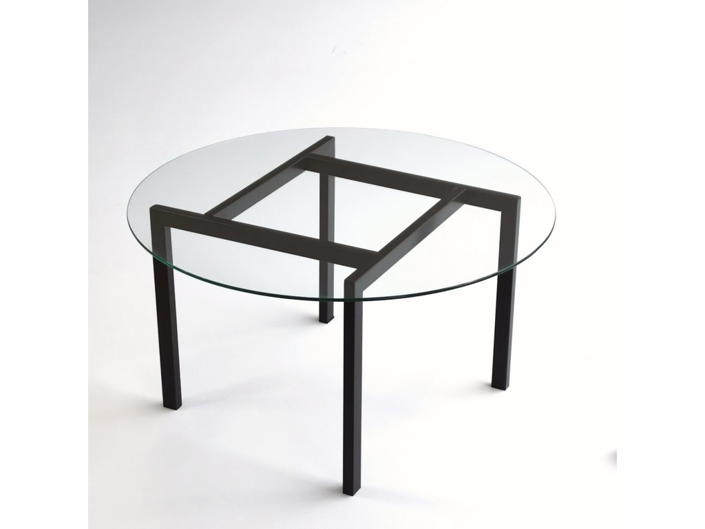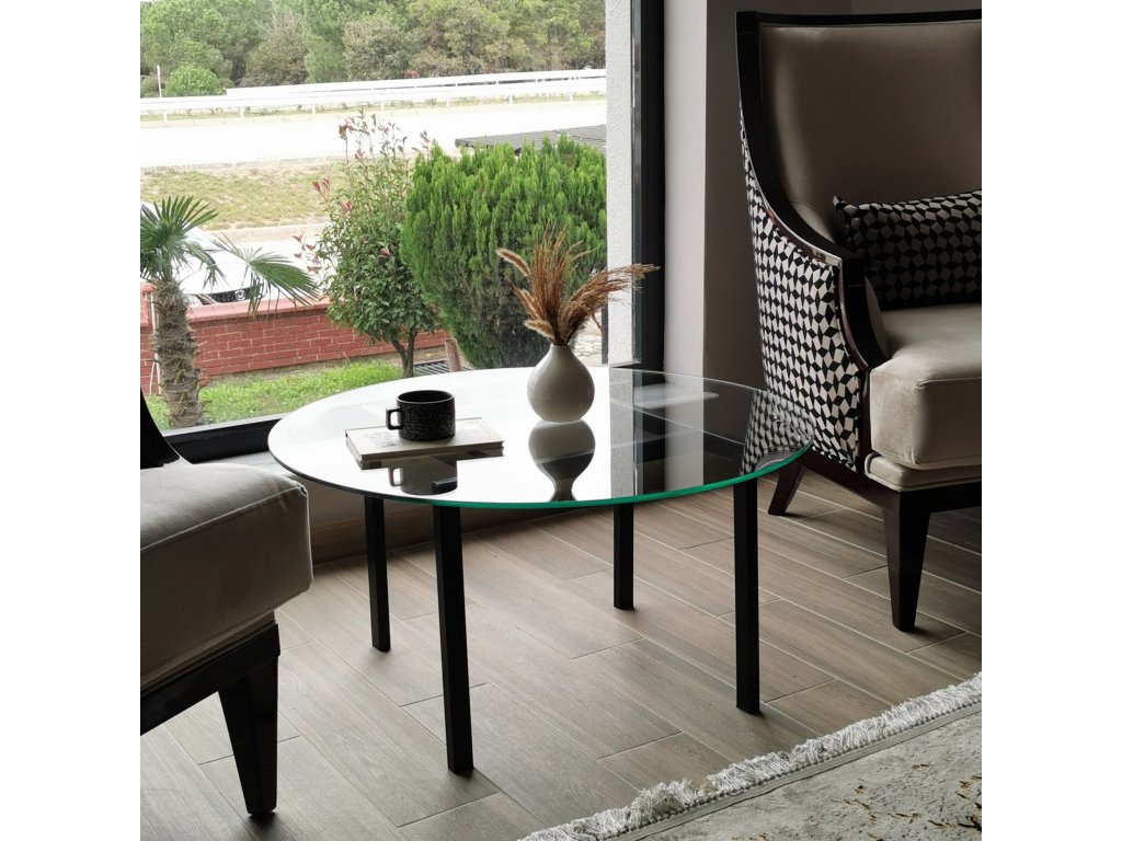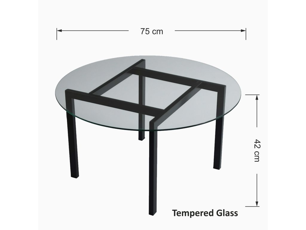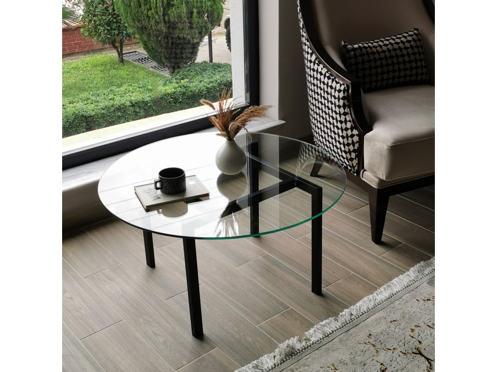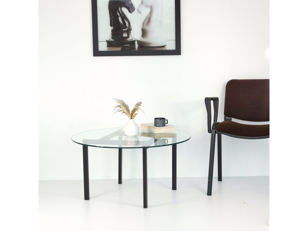 Konferenční stolek BALANCE je vyrobený z černého rámu a kruhové desky čirého tvrzeného skla.