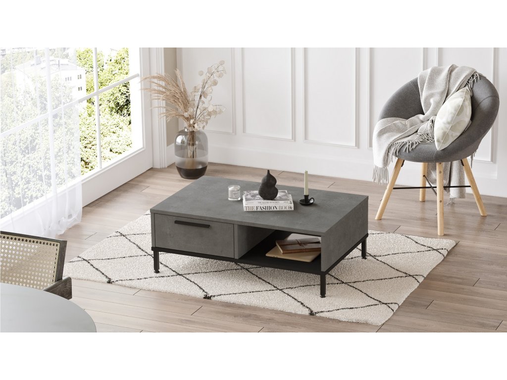 Konferenční stolek s úložným prostorem a praktickou zásuvkou pod hlavní deskou v tmavém dekoru.