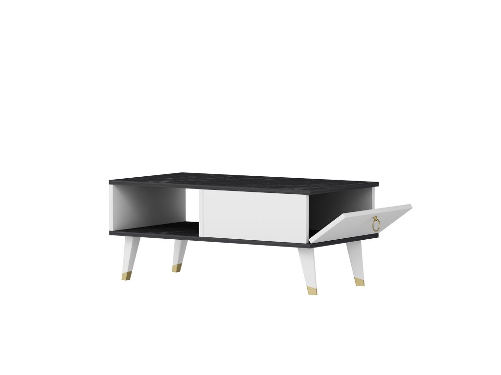 Dvoupatrový konferenční stolek DELUX nabízí nejen v dekoru černý mramor vyrobenou odkládací desku, ale pod ní i další bílé otevřené i dvířky uzavřené úložné prostory.