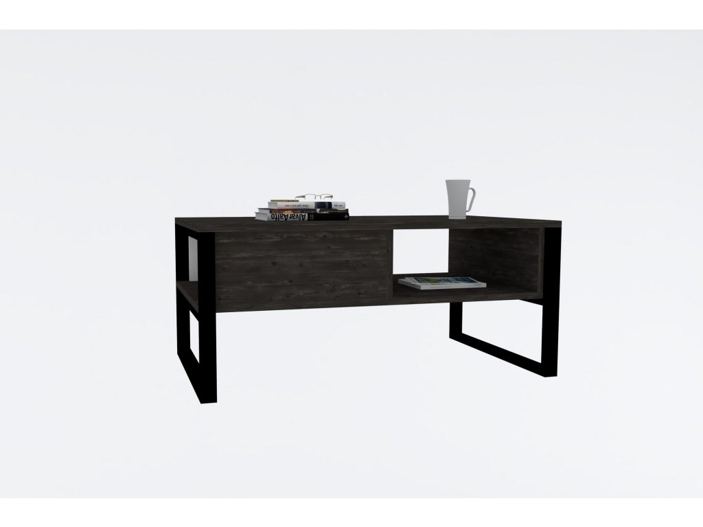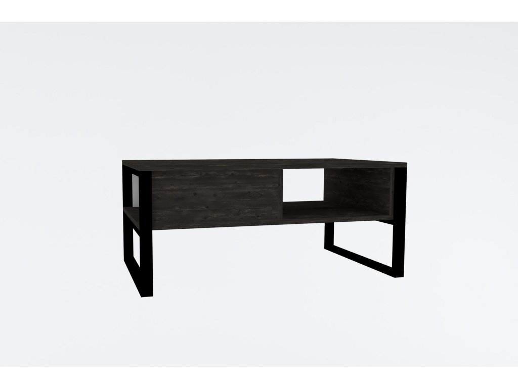 DEVON je konferenční stolek vyrobený ze dvou bočnicemi propojených desek v dekoru antracit, které jsou zasazeny do černých kovových rámů suplujících nohy.